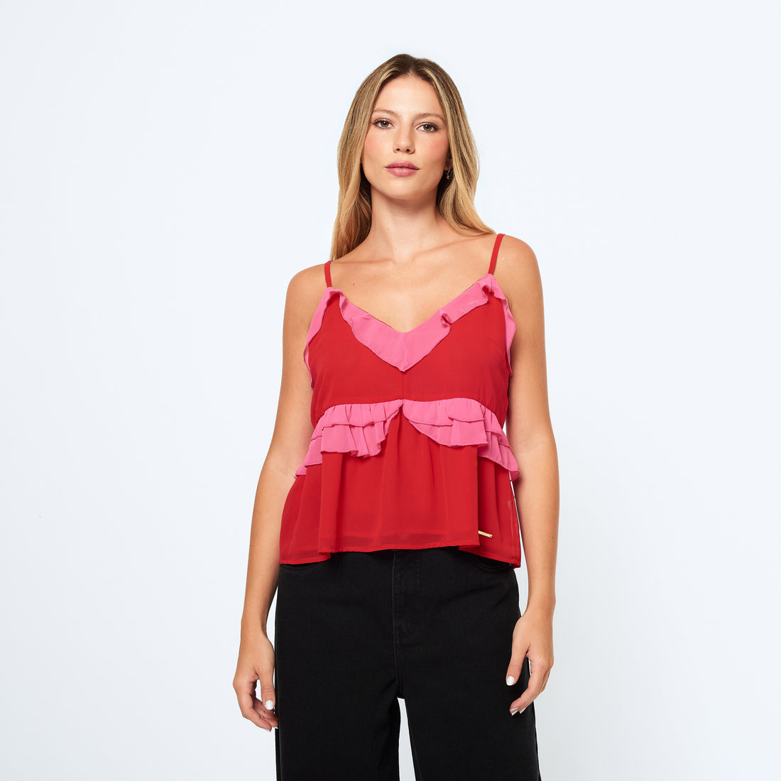 ¡Una blusa imperdible para el verano! Su diseño en gasa con vuelos y tirantes, crea...