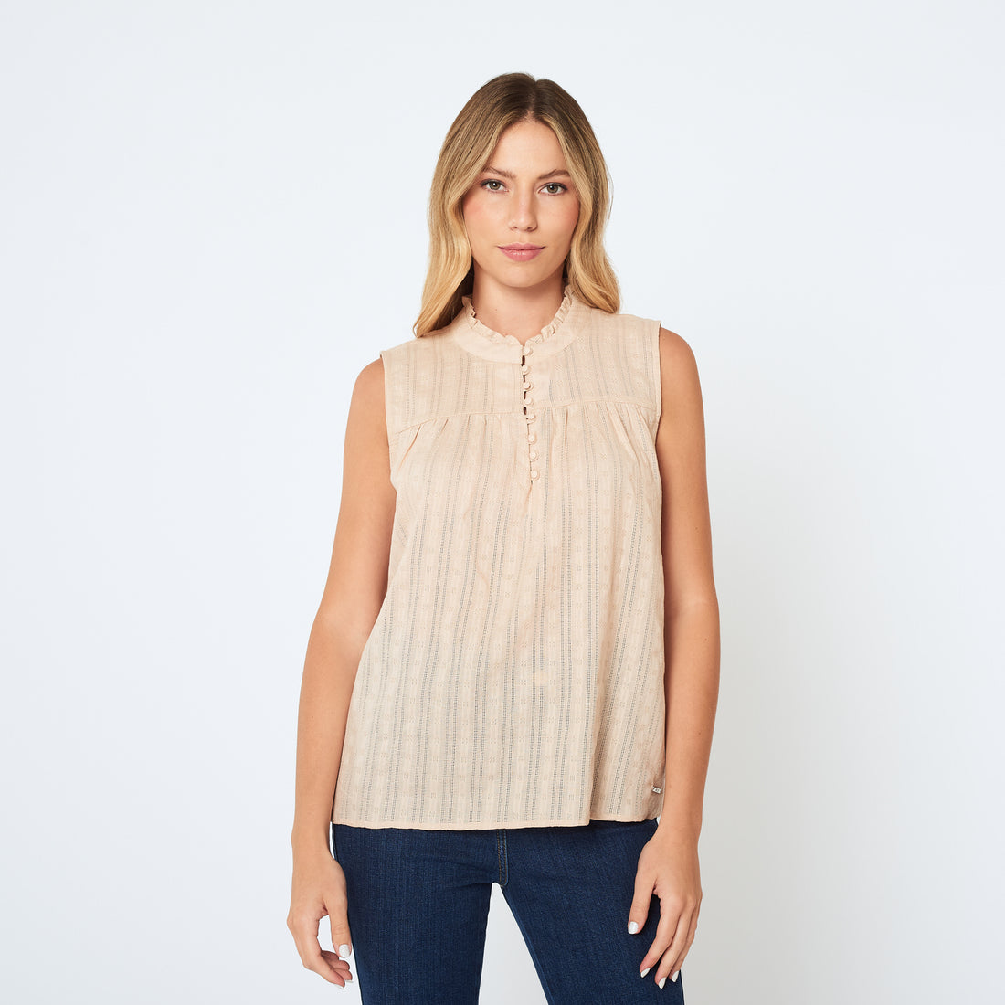 Blusa sin mangas confeccionada en nanzu, diseñada para un estilo elegante y sofisticado. Presenta un...