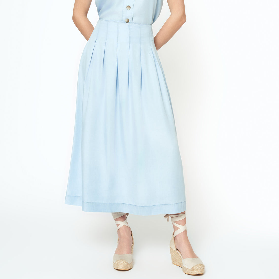 La Falda Melina en celeste es femenina y atemporal. Su tono claro la hace versátil...