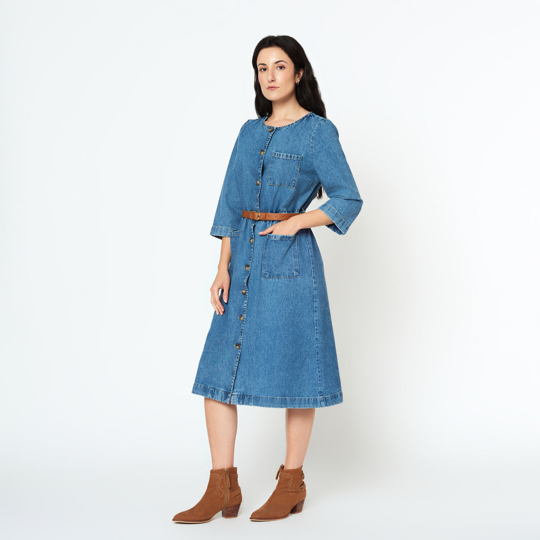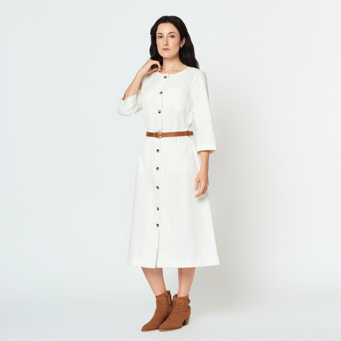 Vestido de silueta recta en bull denim hueso. Su diseño sobrio y atemporal lo convierte...