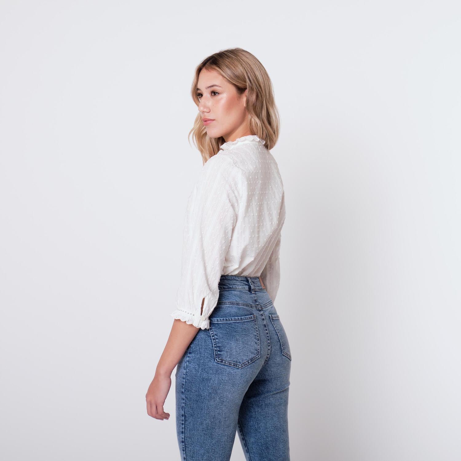 ¡Añade un toque femenino y romántico a tus looks con nuestra Blusa Adela! Amarás su detalle en broderie, pequeños volantes y cuello mao que añaden un toque diferencial a tu look.