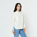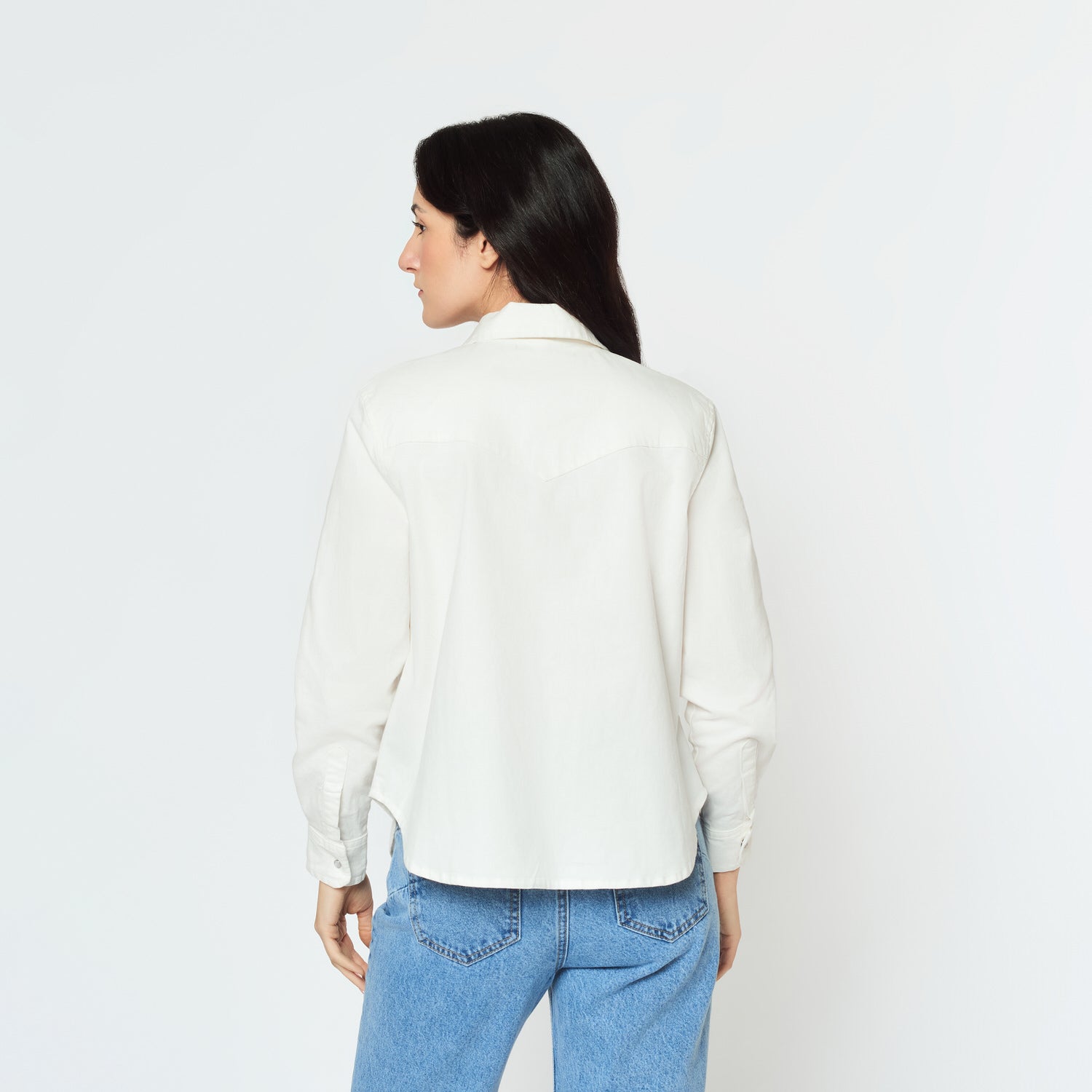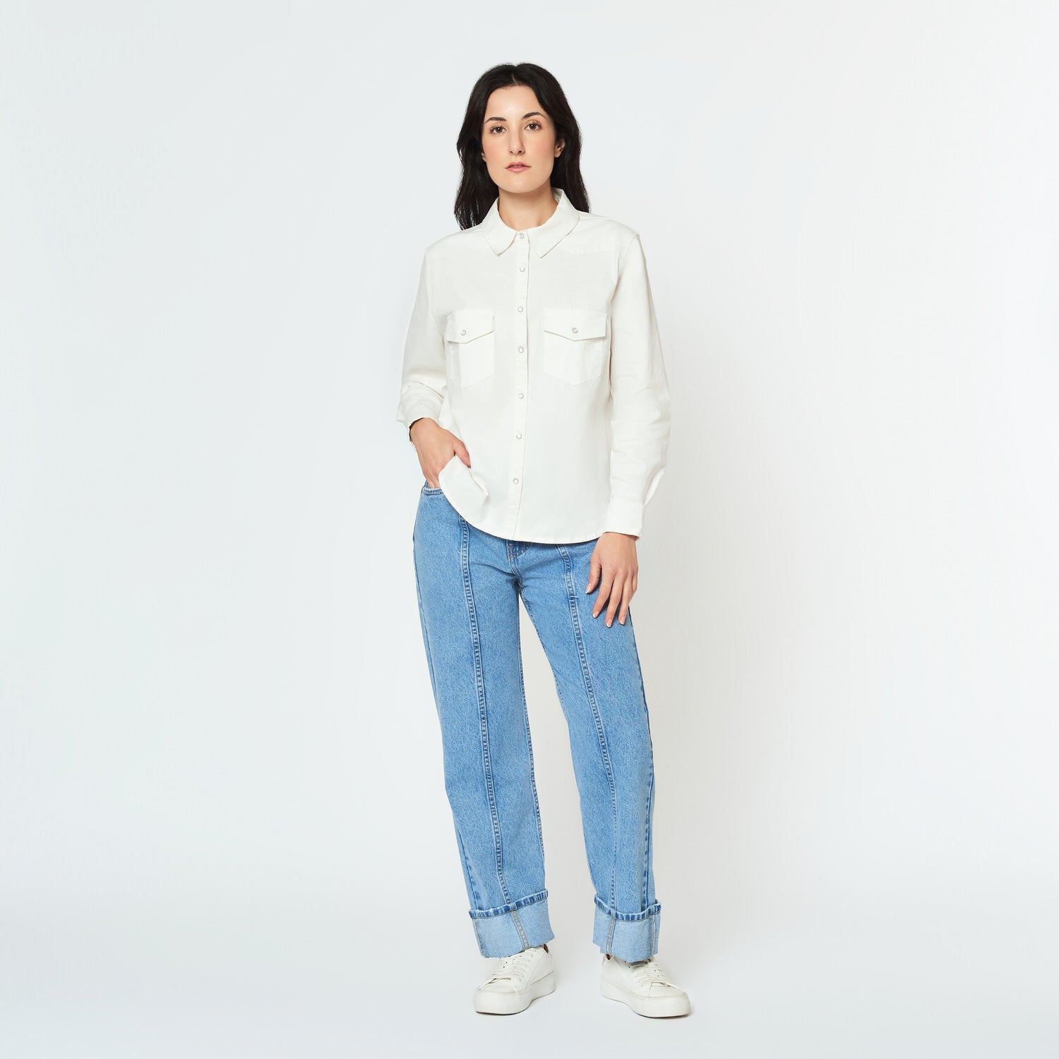 Blusa camisera elegante, elaborada en drill color hueso. Su estructura firme ofrece una silueta definida sin perder comodidad, perfecta para ambientes formales o semiformal.