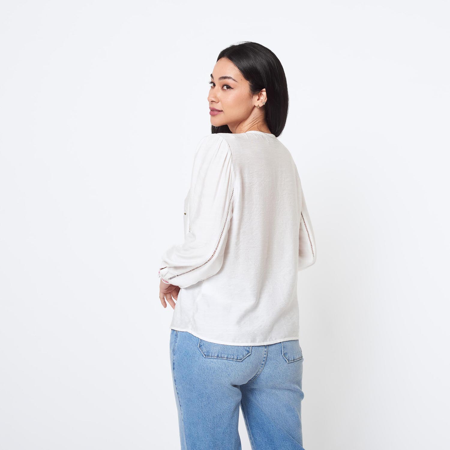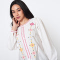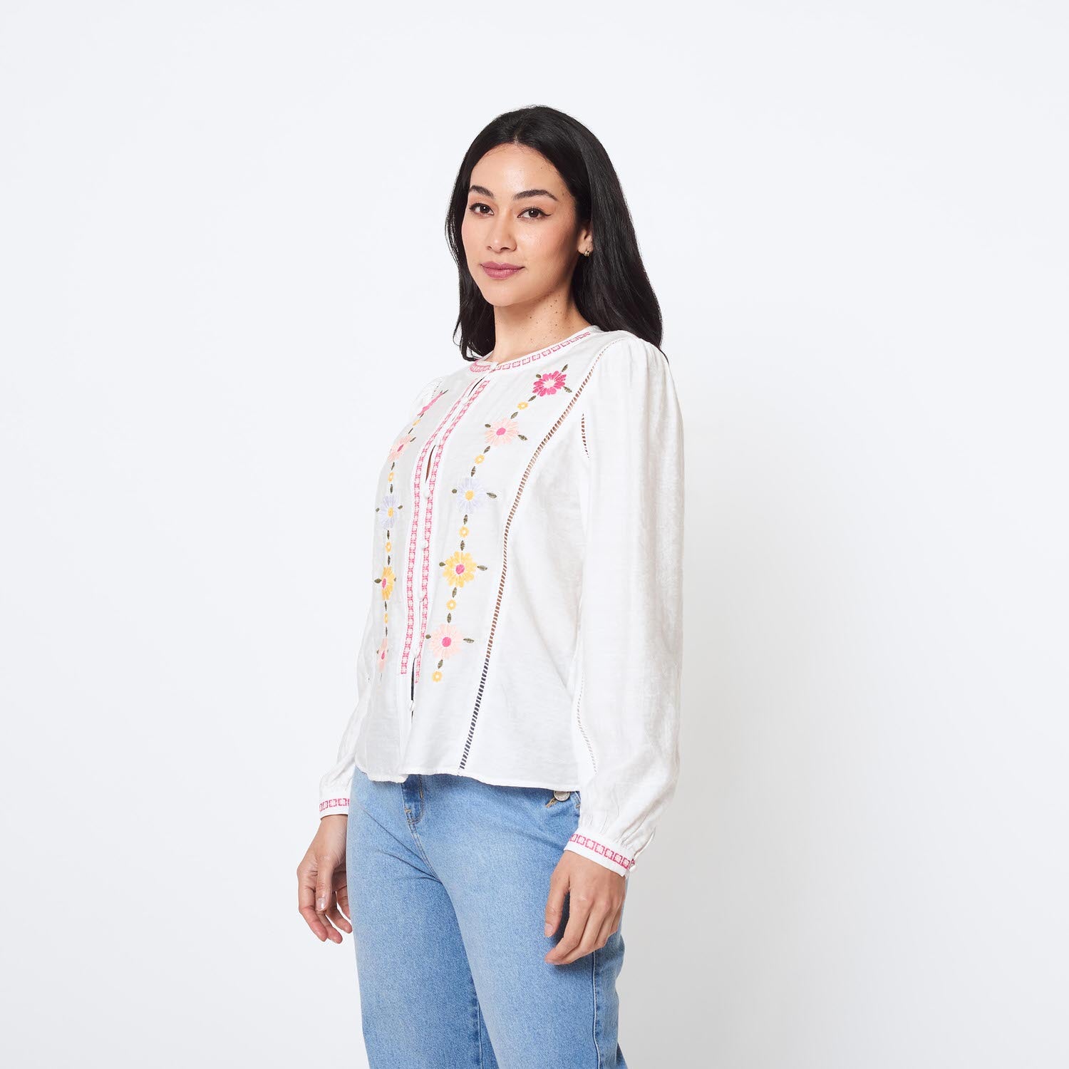 Nuestra Blusa Federica, confeccionada en un clásico color hueso, destaca por sus encantadores bordados florales en colores vibrantes, delicados botones a tono, detalles de bolillos y mangas abullonadas que añaden un estilo único y fresco.