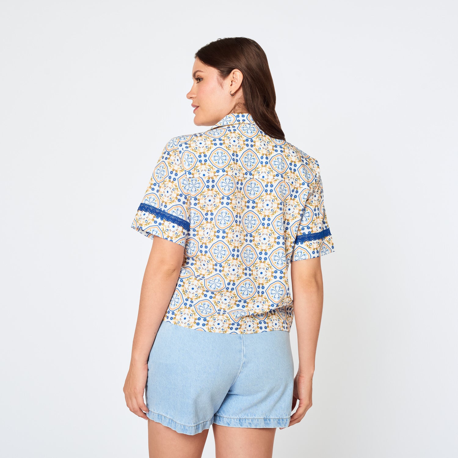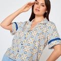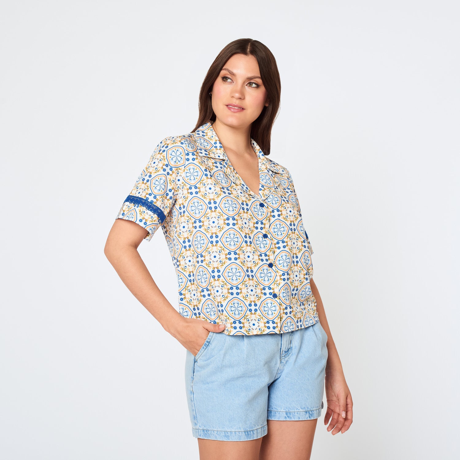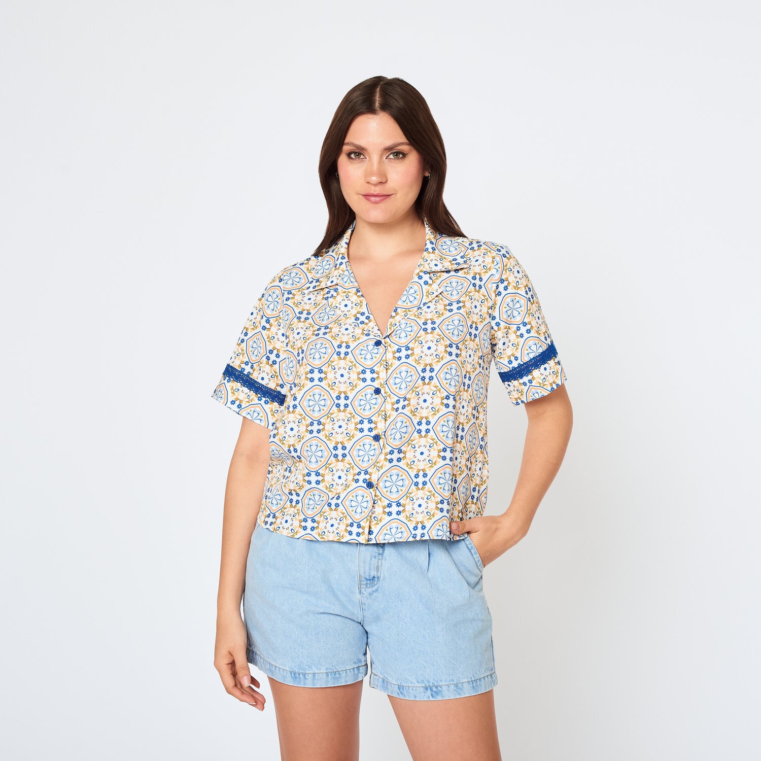 Blusa con un print llamativo de cuello clásico y las mangas cortas la convierten en una prenda versátil que puedes combinar con diferentes estilos.