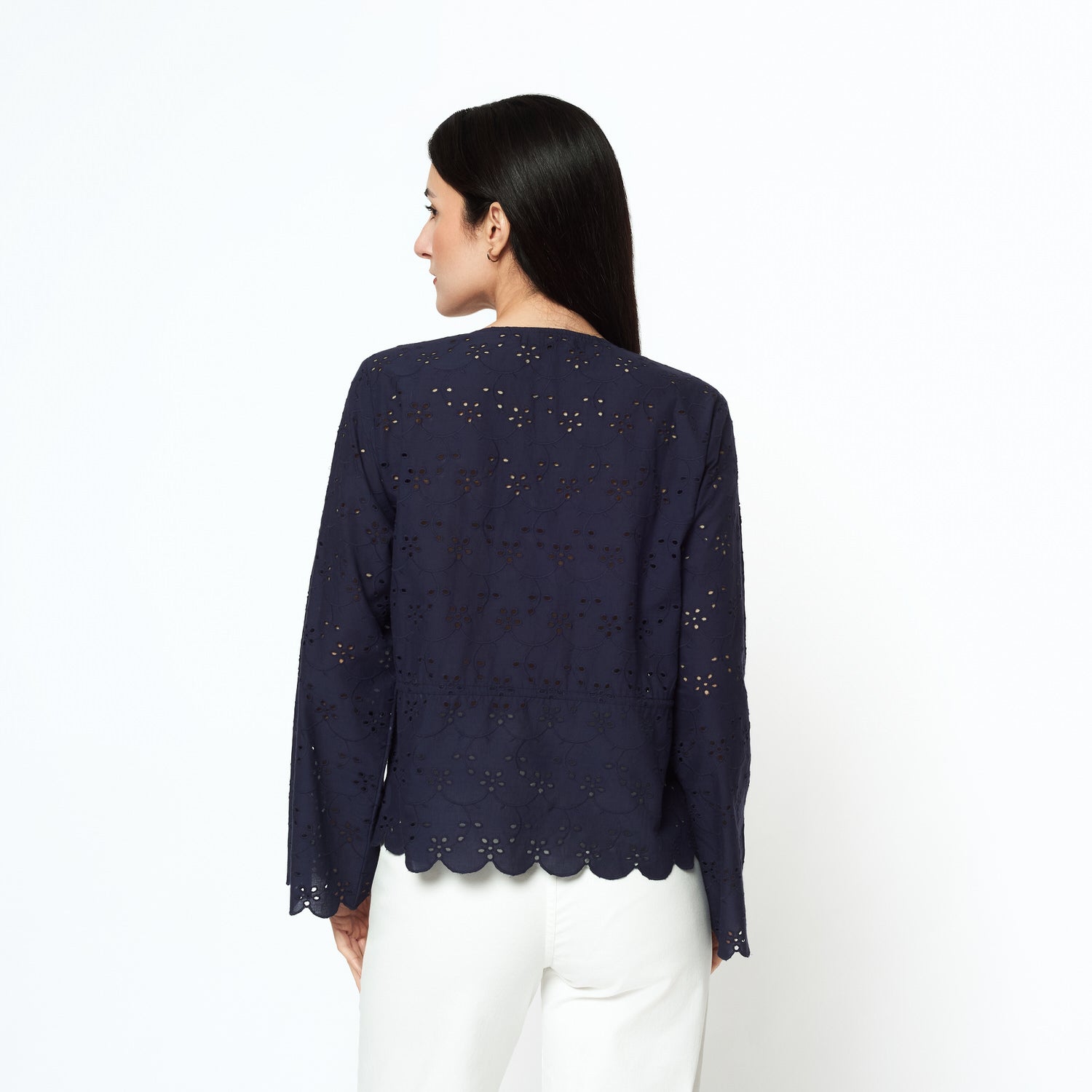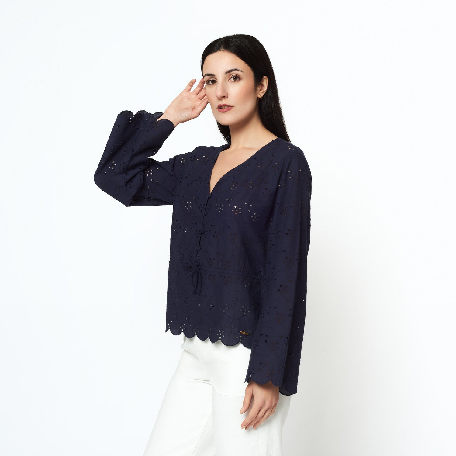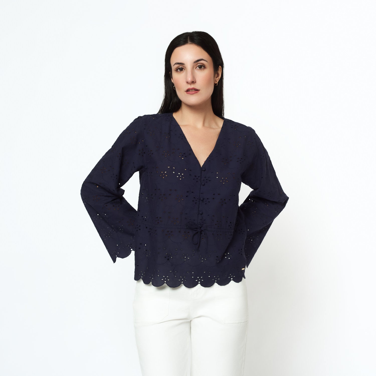 Confeccionada en broderie azul, la blusa Pamela destaca por su frescura y estilo romántico. El color aporta vitalidad, mientras que la textura ligera la convierte en una pieza perfecta para outfits casuales con un aire sofisticado.