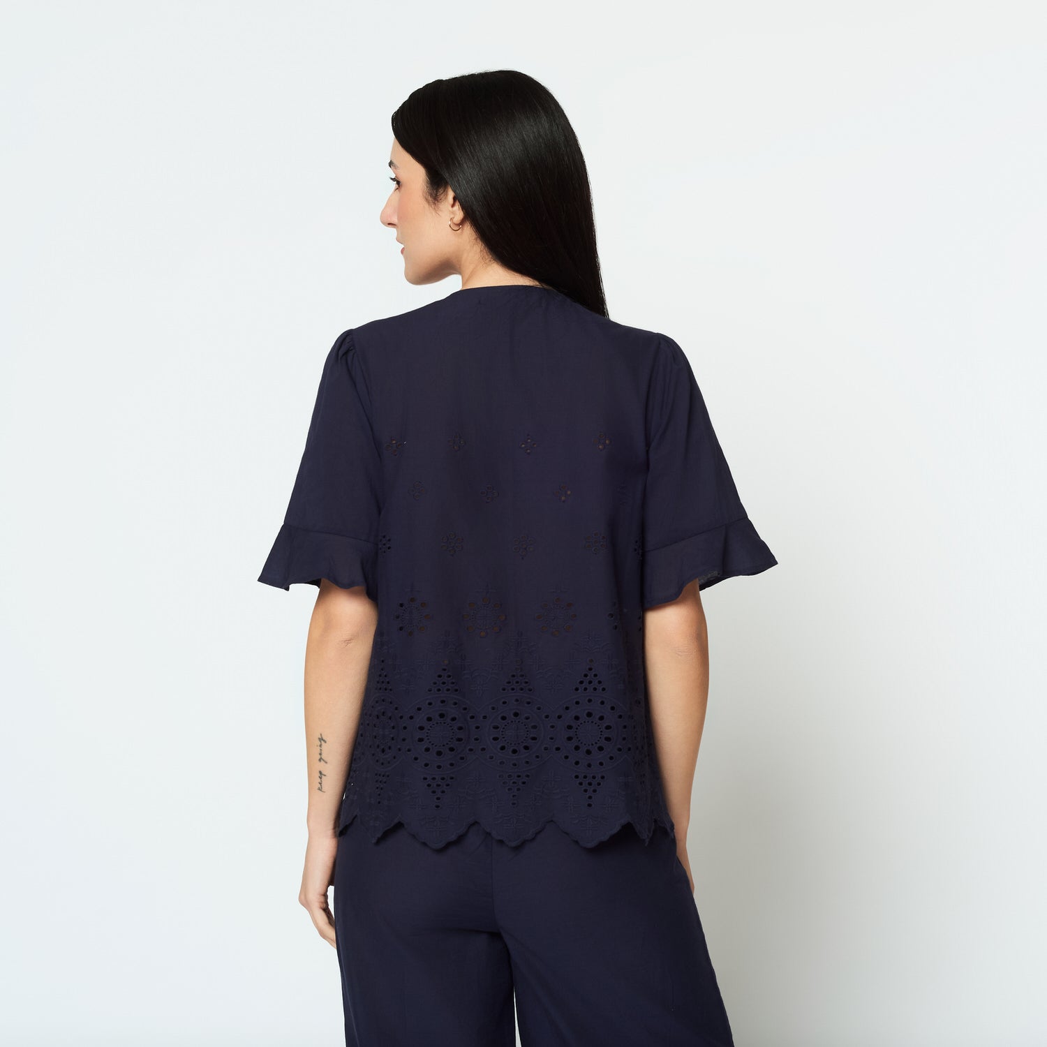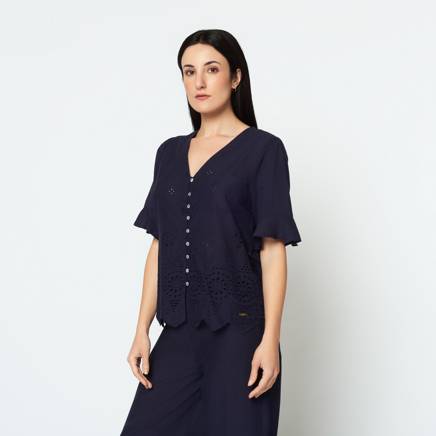 La blusa Paula en broderie azul es femenina y sofisticada. Su textura calada aporta ligereza y dinamismo, mientras que el color intenso ilumina cualquier look. Perfecta para usar con denim claro o pantalones neutros, creando un estilo chic.