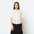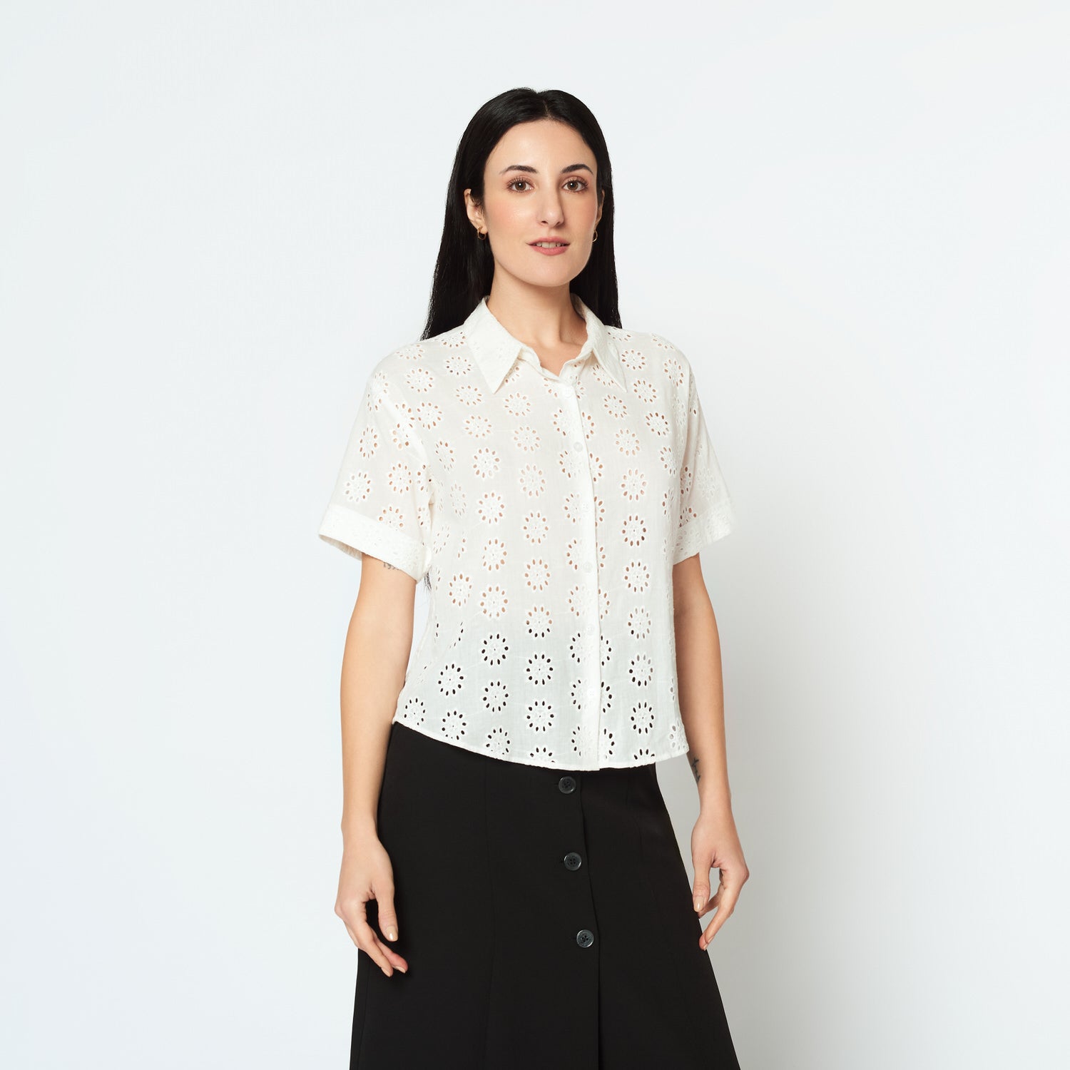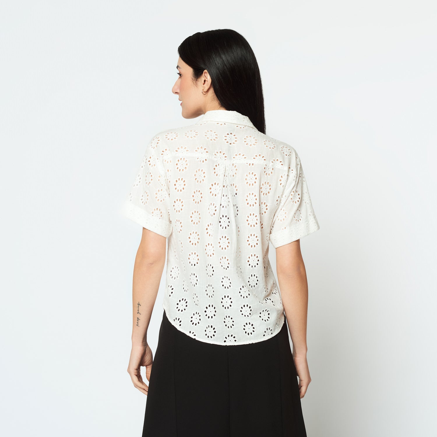 La blusa Pia en broderie hueso es una pieza ligera y muy versátil. Su textura romántica y su tono claro se adaptan a cualquier ocasión, desde un look relajado de día hasta uno más sofisticado en la noche.
