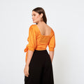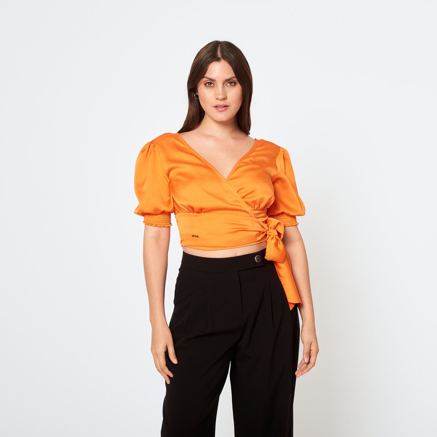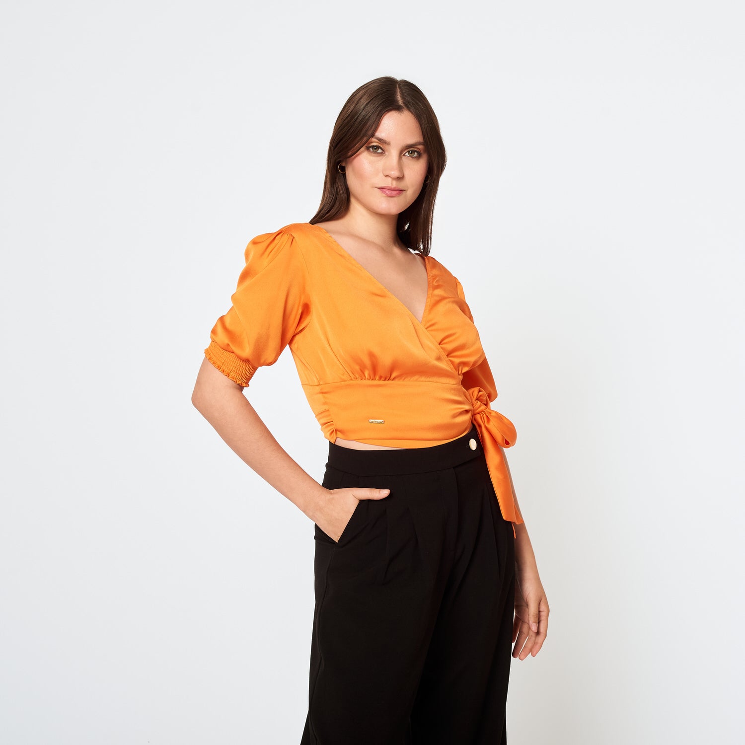 Su diseño cruzado con escote en V junto con el lazo en la cintura, acentúa la figura creando un efecto visualmente favorecedor y permite ajustar la blusa a tu gusto.