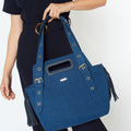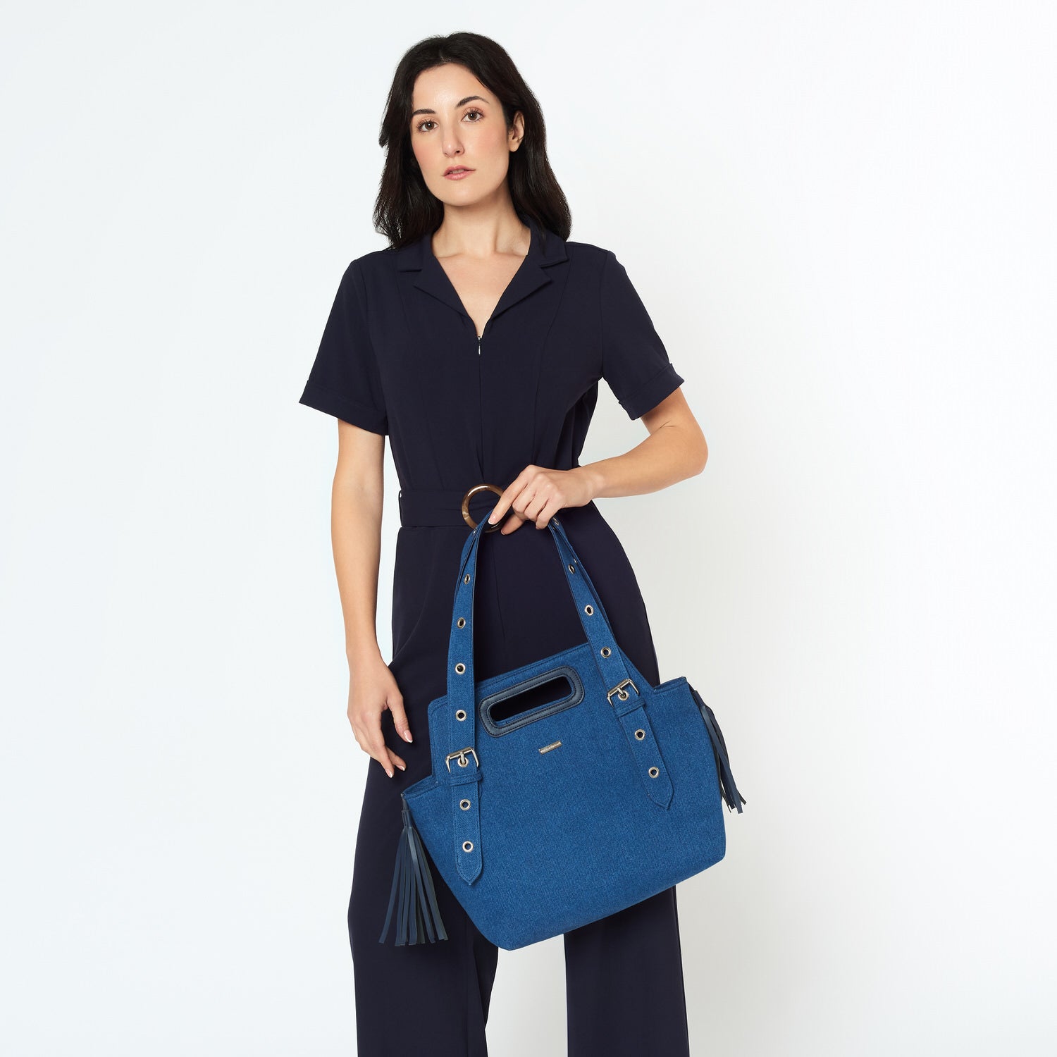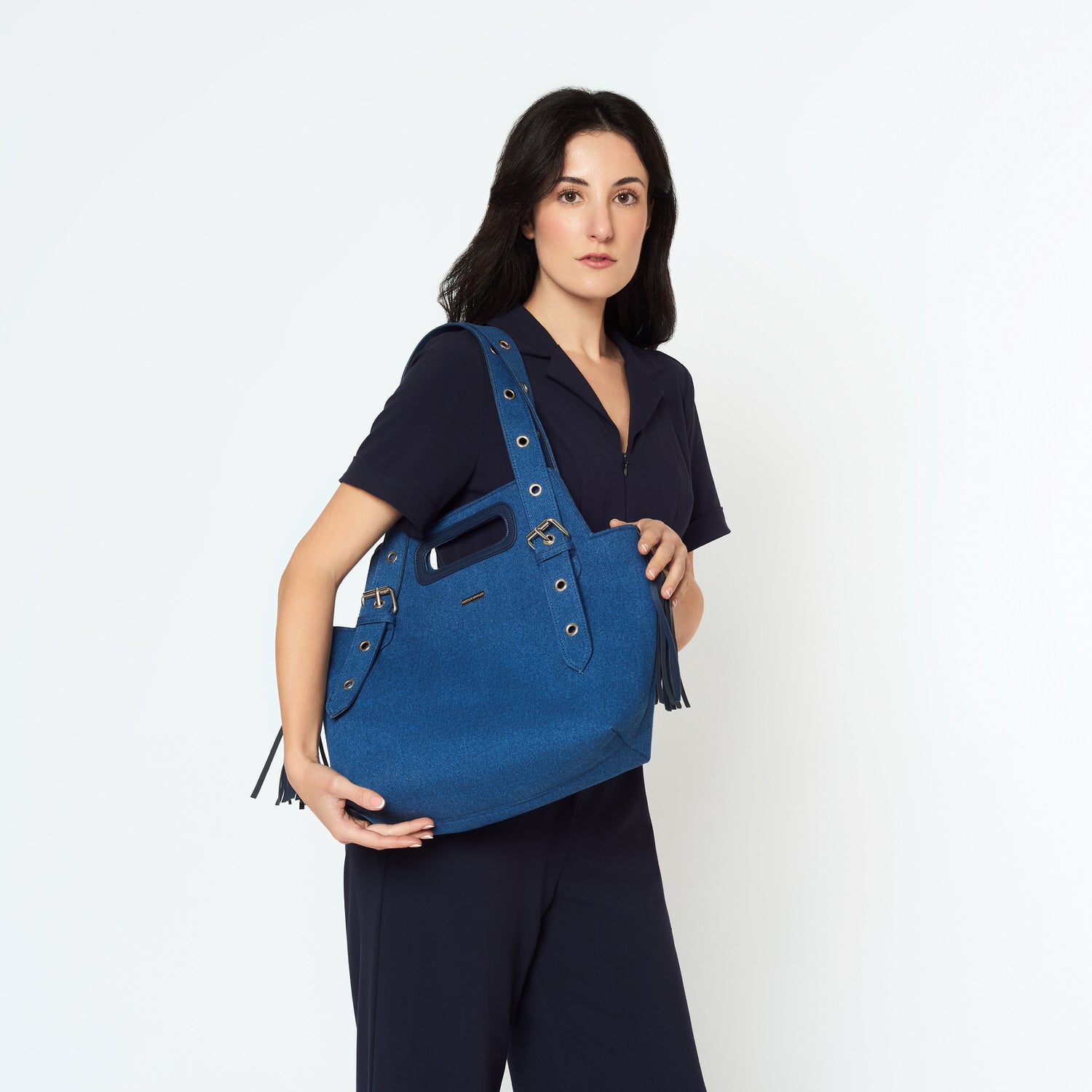 Cartera confeccionada en denim rígido azul. Diseño contemporáneo que fusiona la estética casual del denim con una estructura resistente. Ideal para complementar outfits urbanos y relajados con un toque moderno.