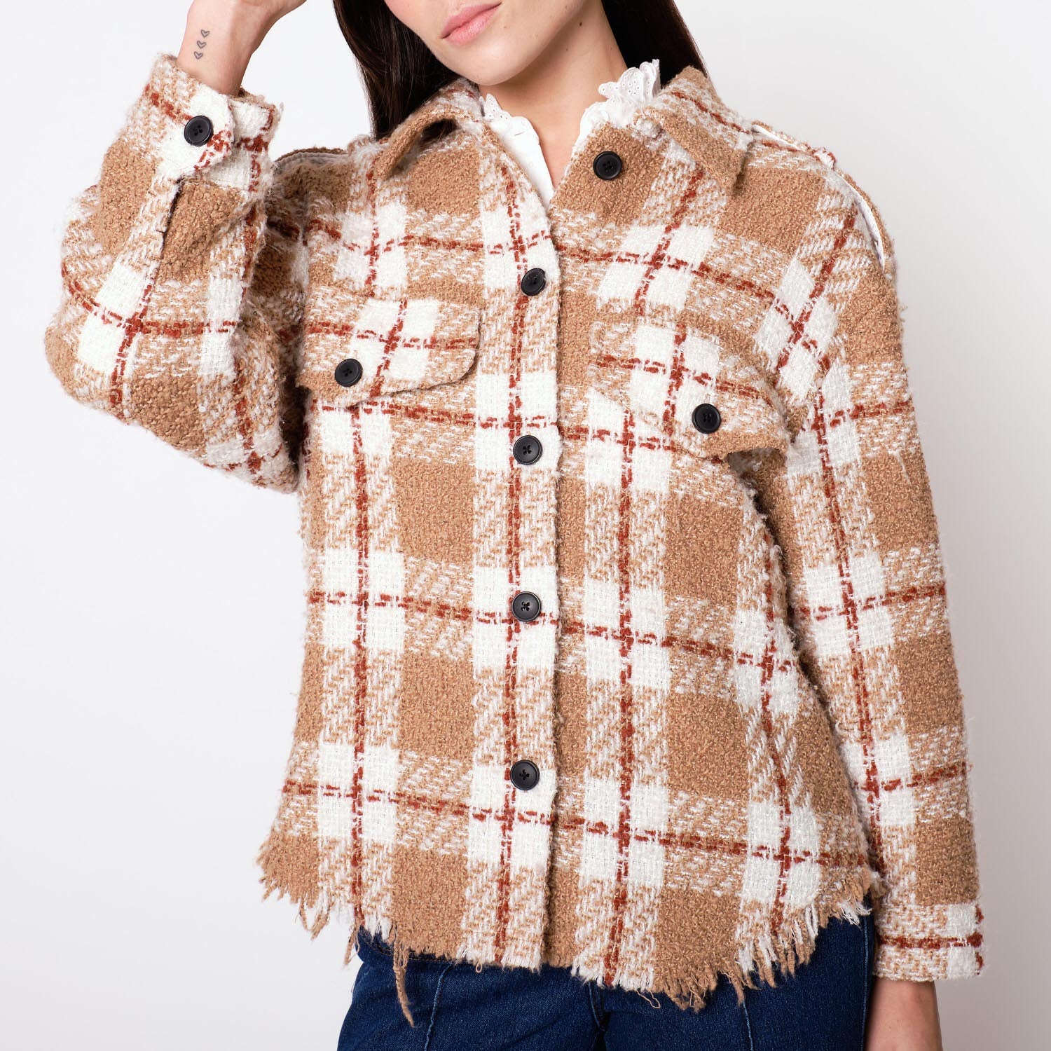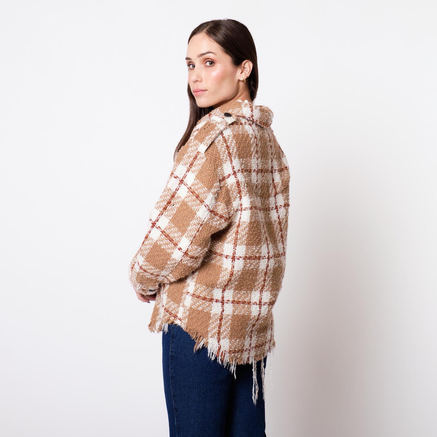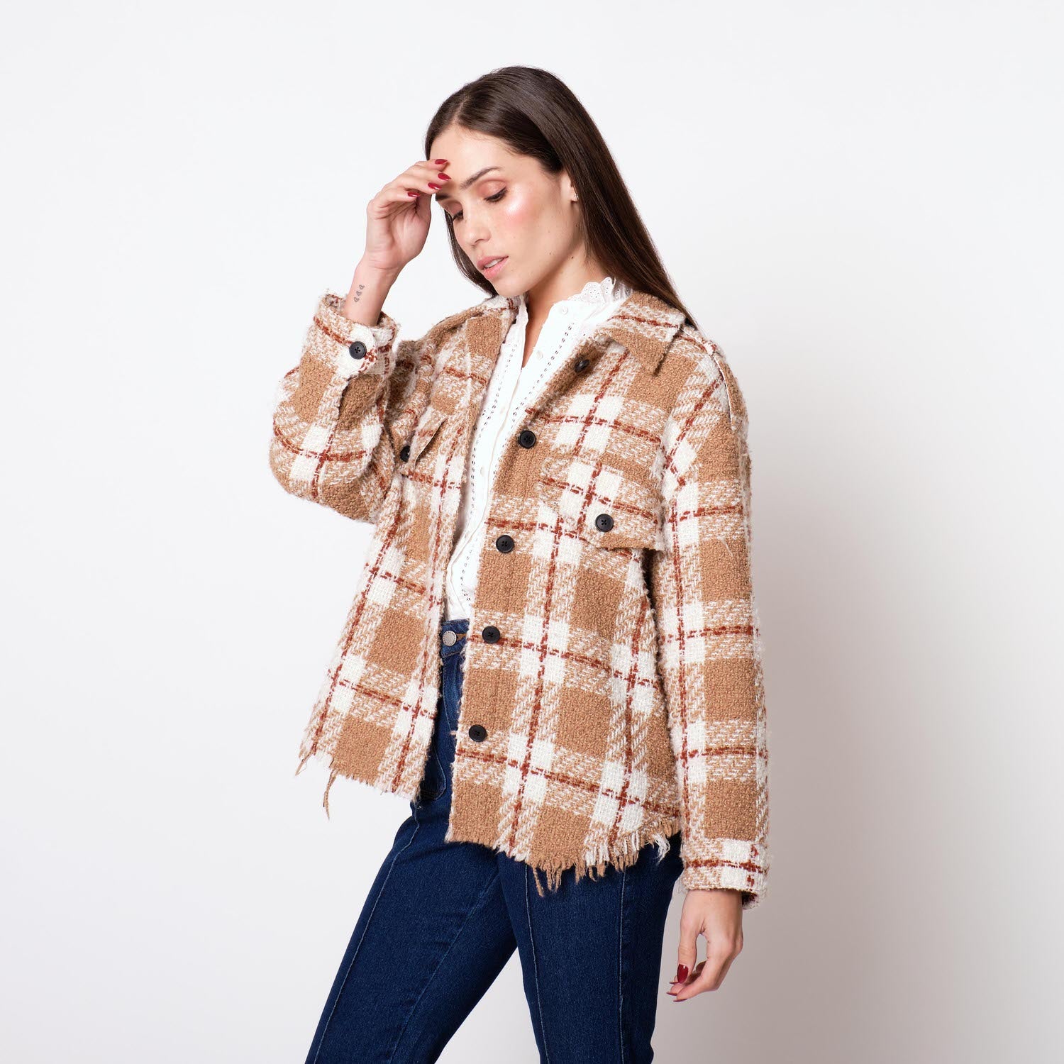 ¡Añade un toque imponente y refinado a tus looks! Nuestra Casaca Marlene confeccionada en tweed es la opción perfecta para lucir chic y a la moda. Amarás su diseño a cuadros, detalles de botones negros, cuello camisero y borde deshilado.