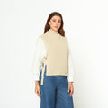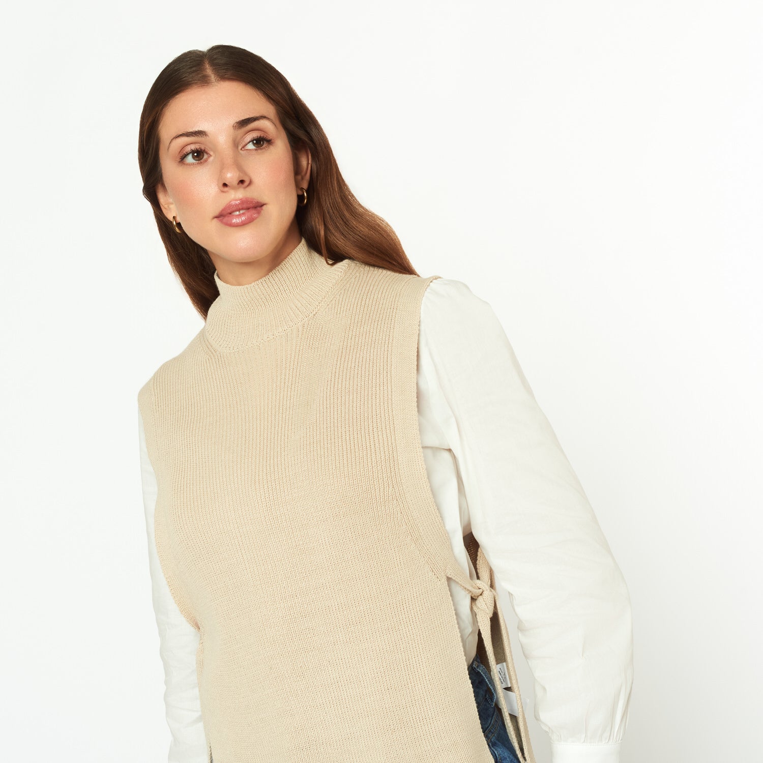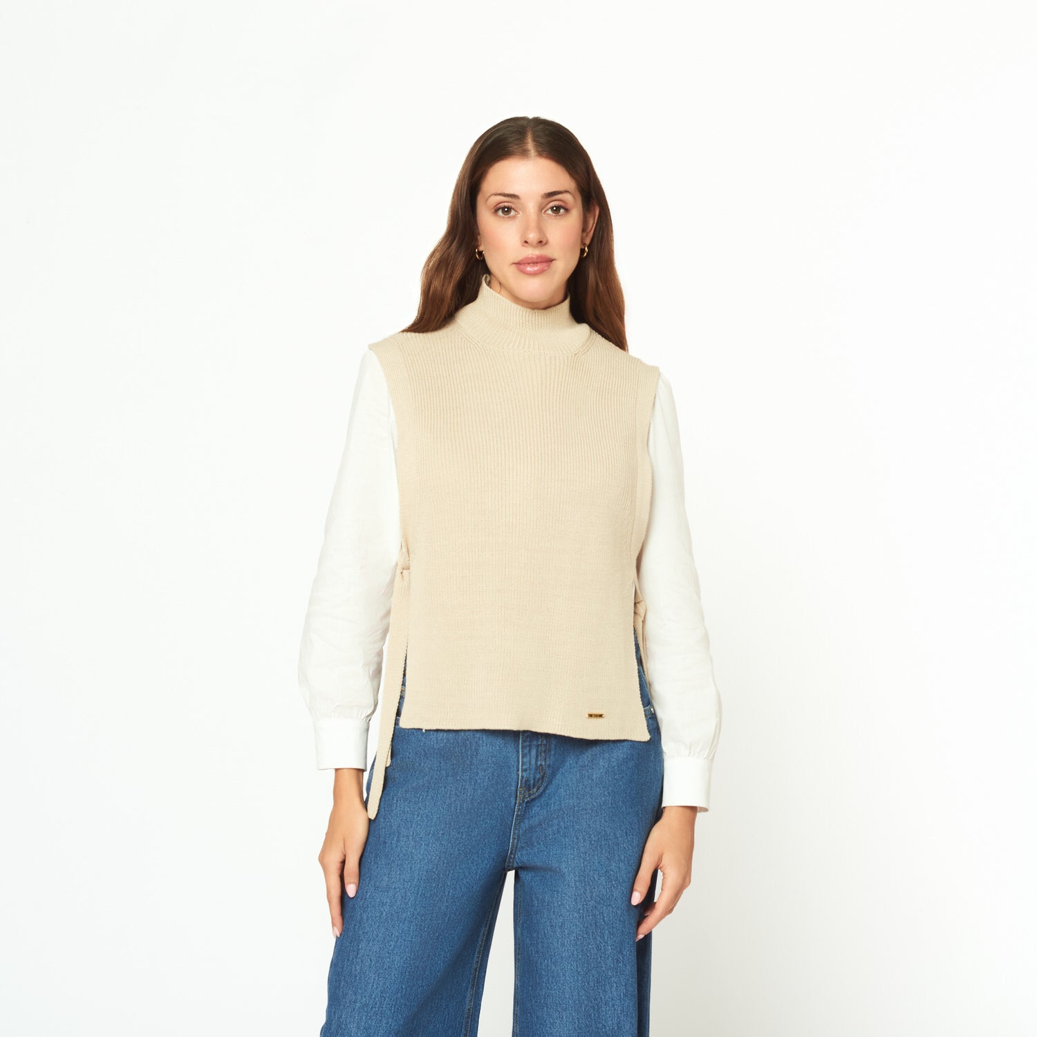 Chaleco tejido cuello alto con lazo regulables a los laterales.