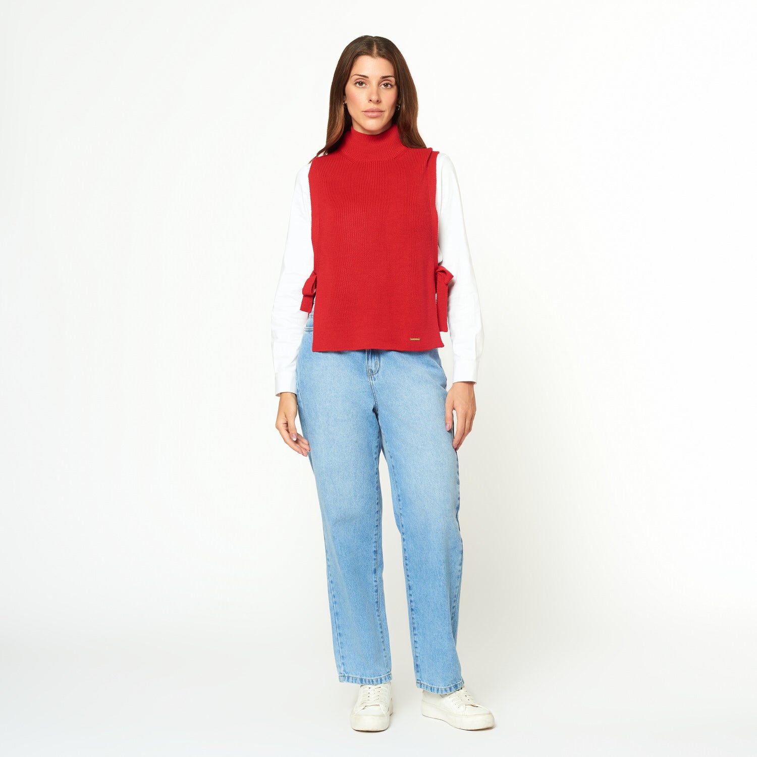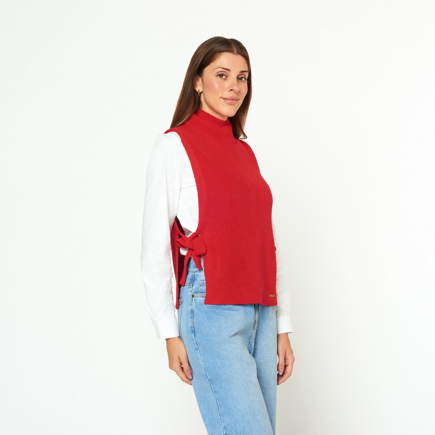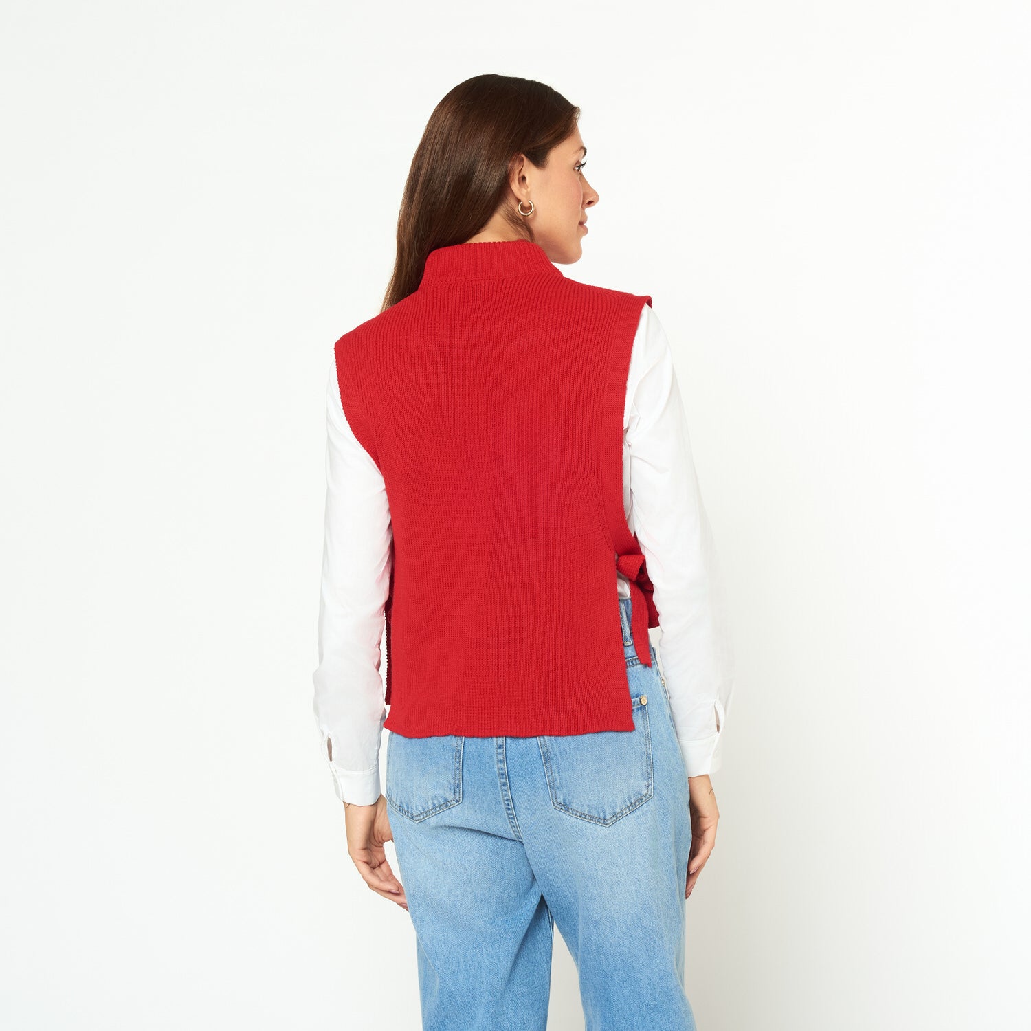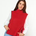Chaleco tejido cuello alto con lazo regulables a los laterales.