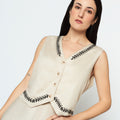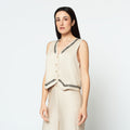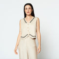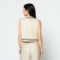 El chaleco Fidencia en viscosa arena aporta un aire fresco y moderno a tus outfits. Su tonalidad neutra lo convierte en un complemento ideal para superponer sobre blusas o polos, logrando un look casual chic con textura.