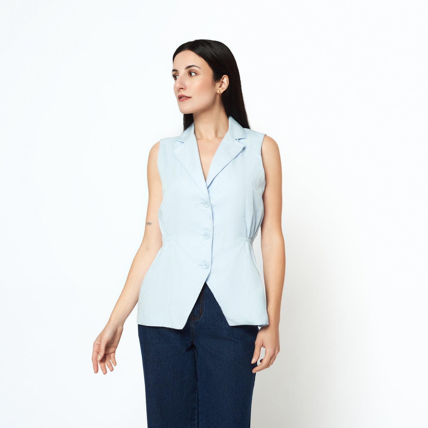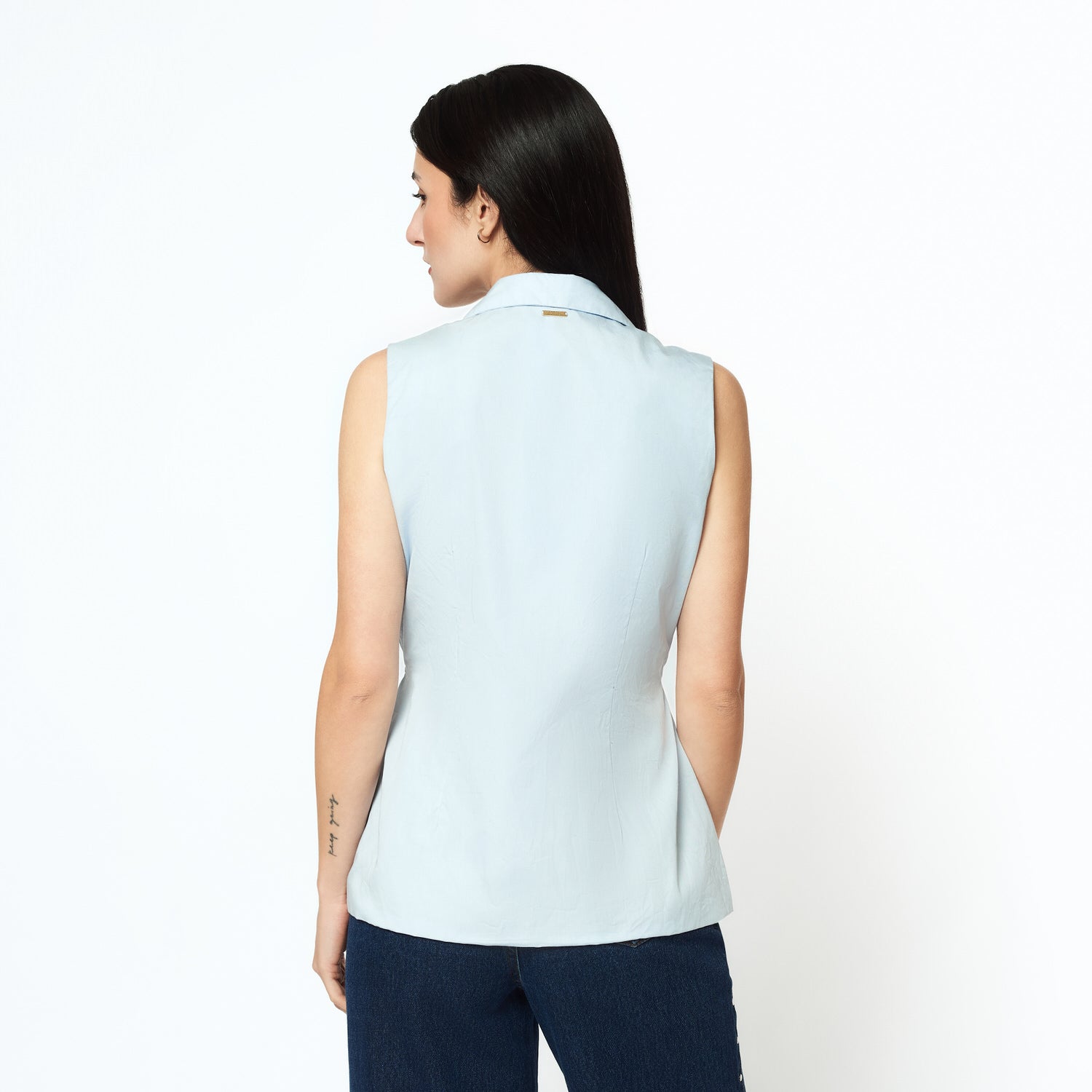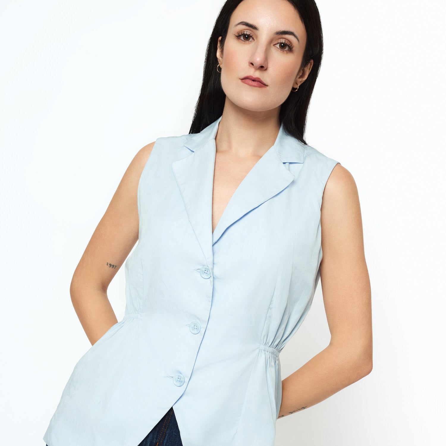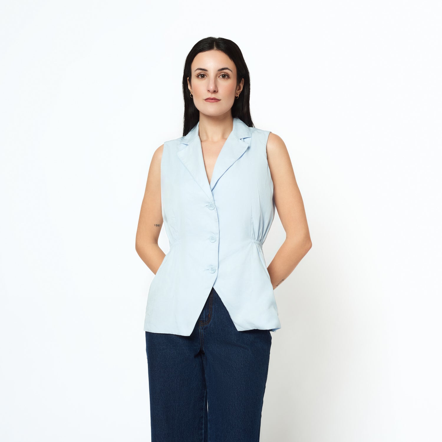 El chaleco Imalina en tencel celeste aporta un aire relajado y chic a tu outfit. Su diseño sin mangas estiliza y lo convierte en la pieza perfecta para superponer sobre blusas o tops. Ideal para looks de media estación.