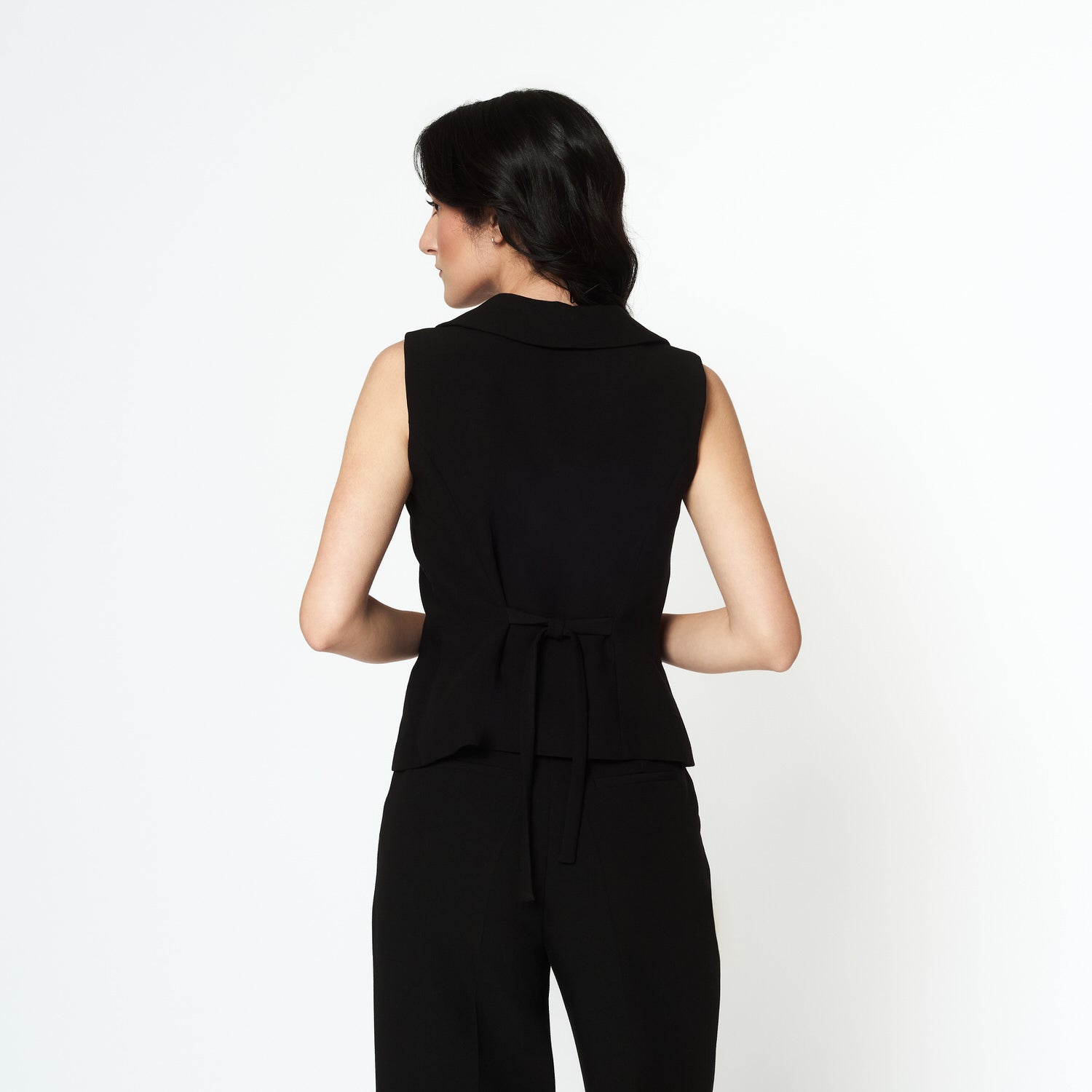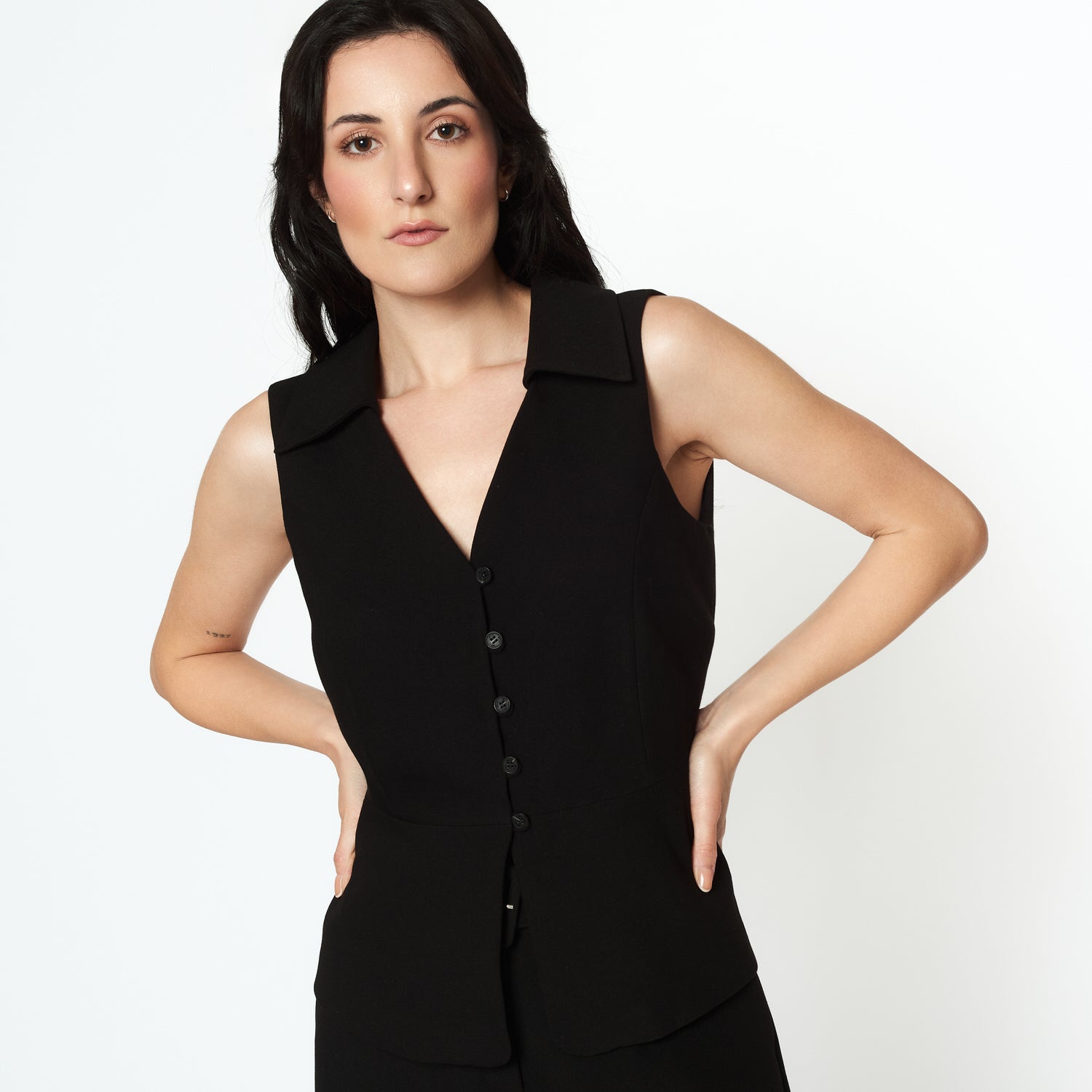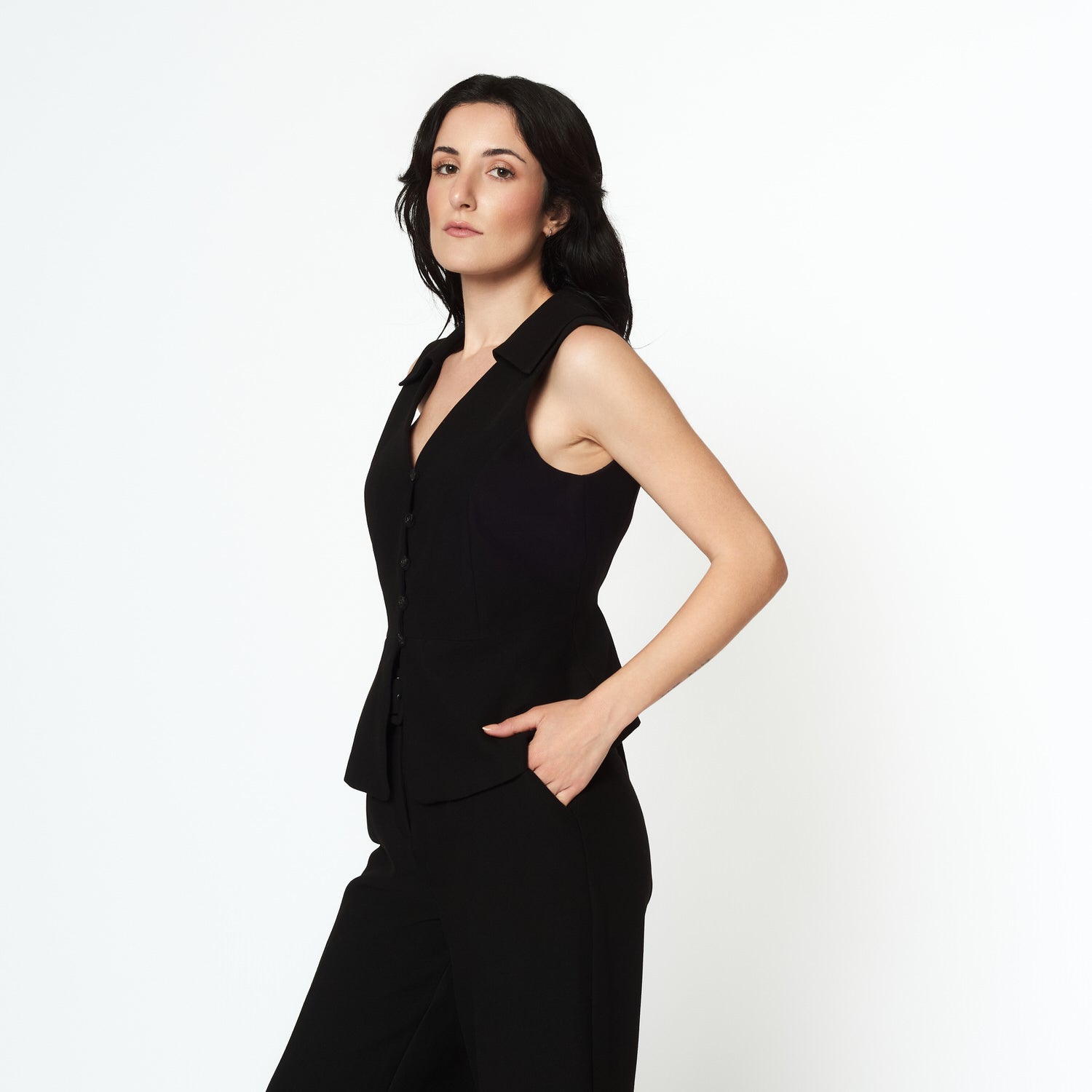 El Chaleco Lexa en negro es elegante y versátil. Su color sobrio lo convierte en una prenda imprescindible para completar tus looks con un aire sofisticado y actual.
