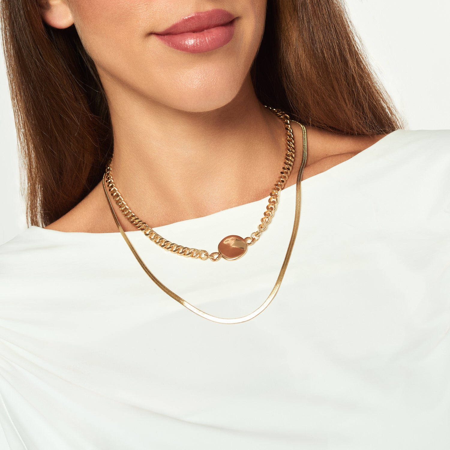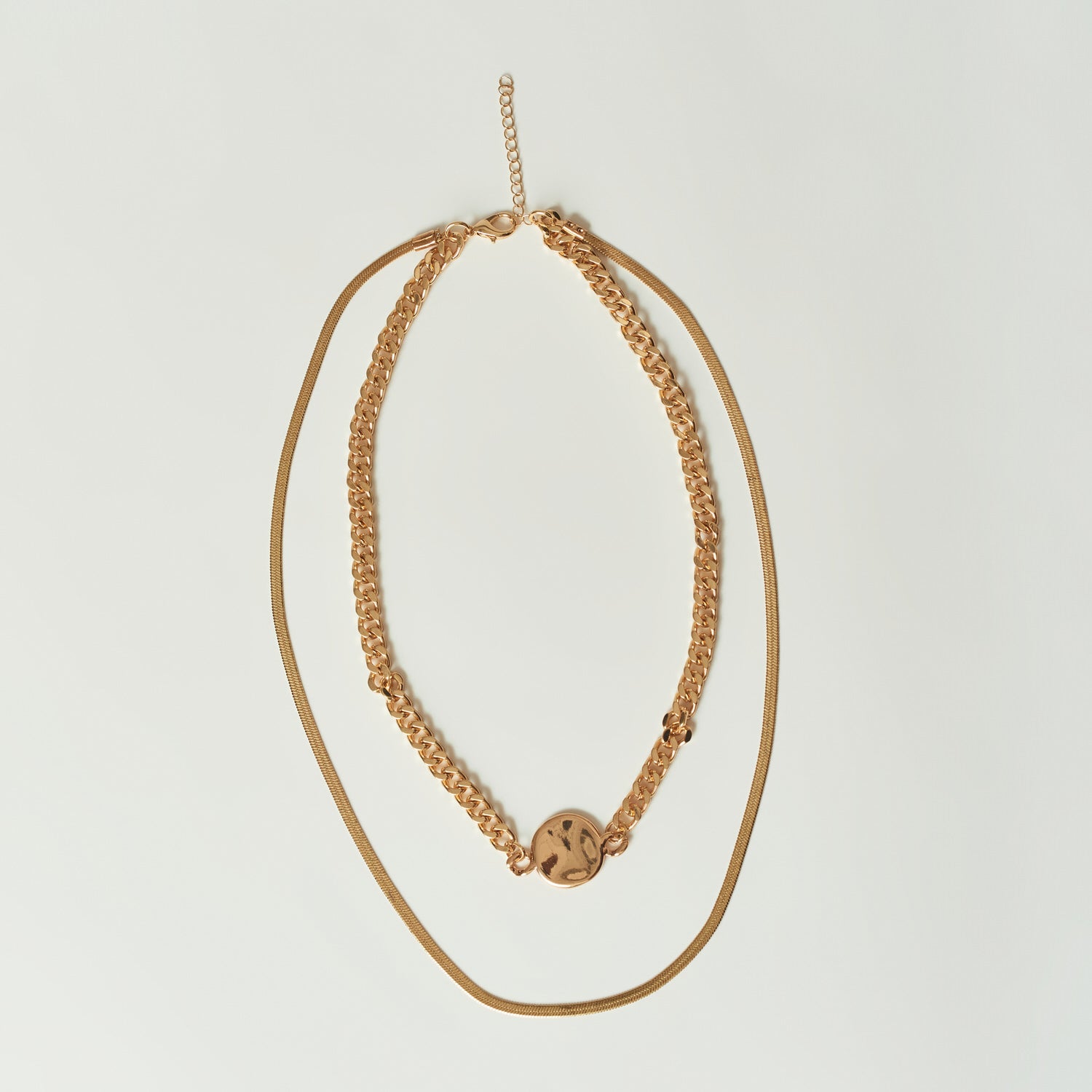 Collar en dos tiempos con medalla en el centro color dorado.