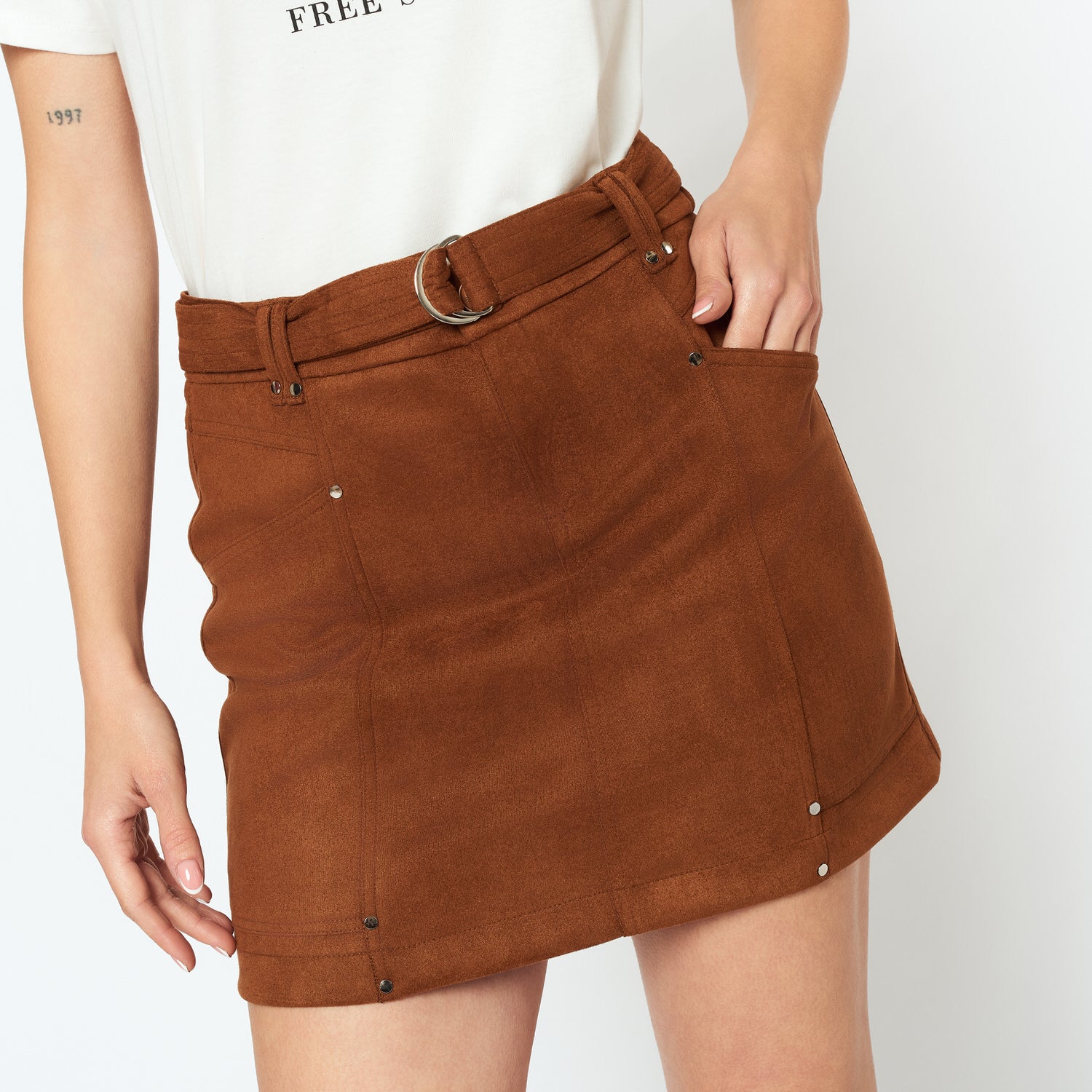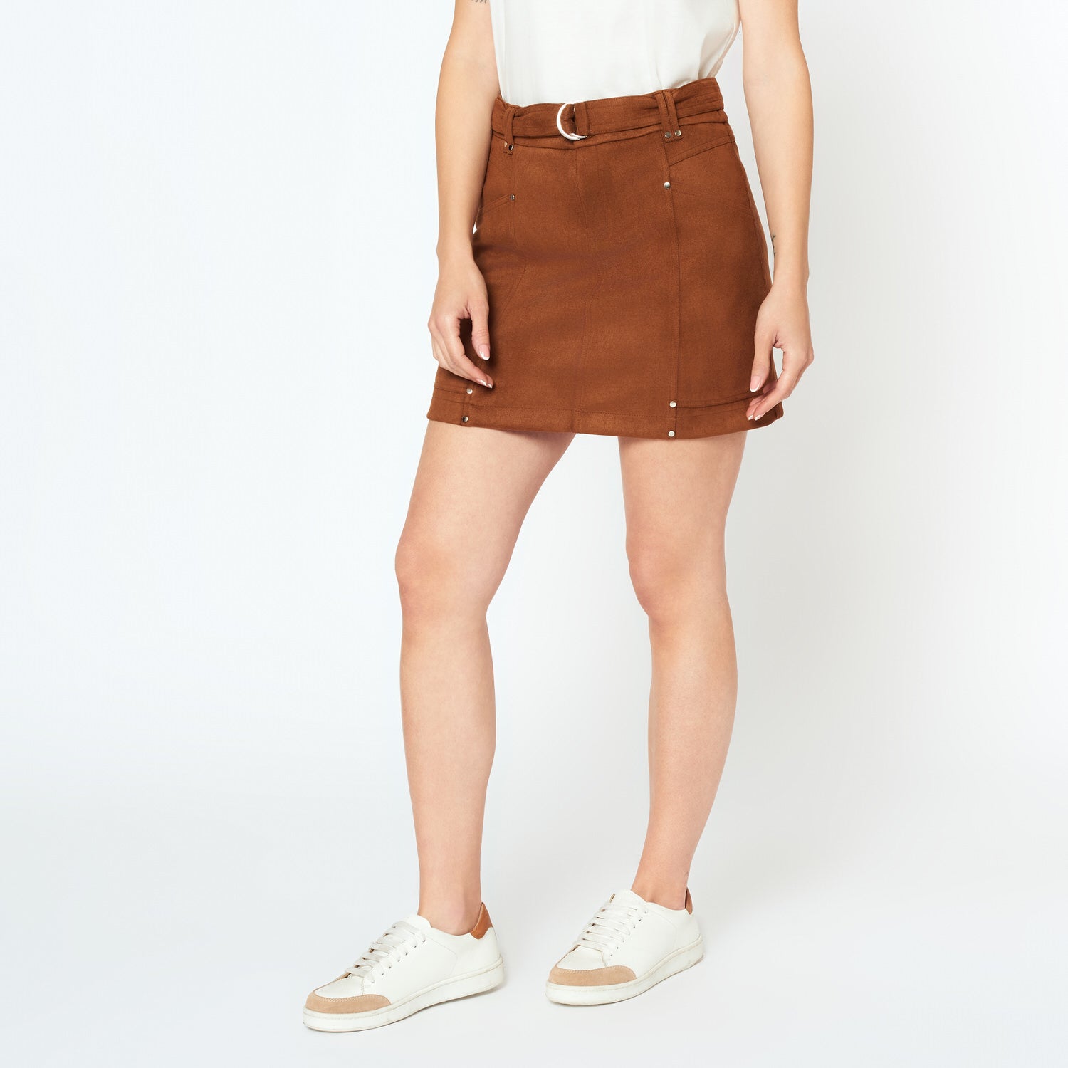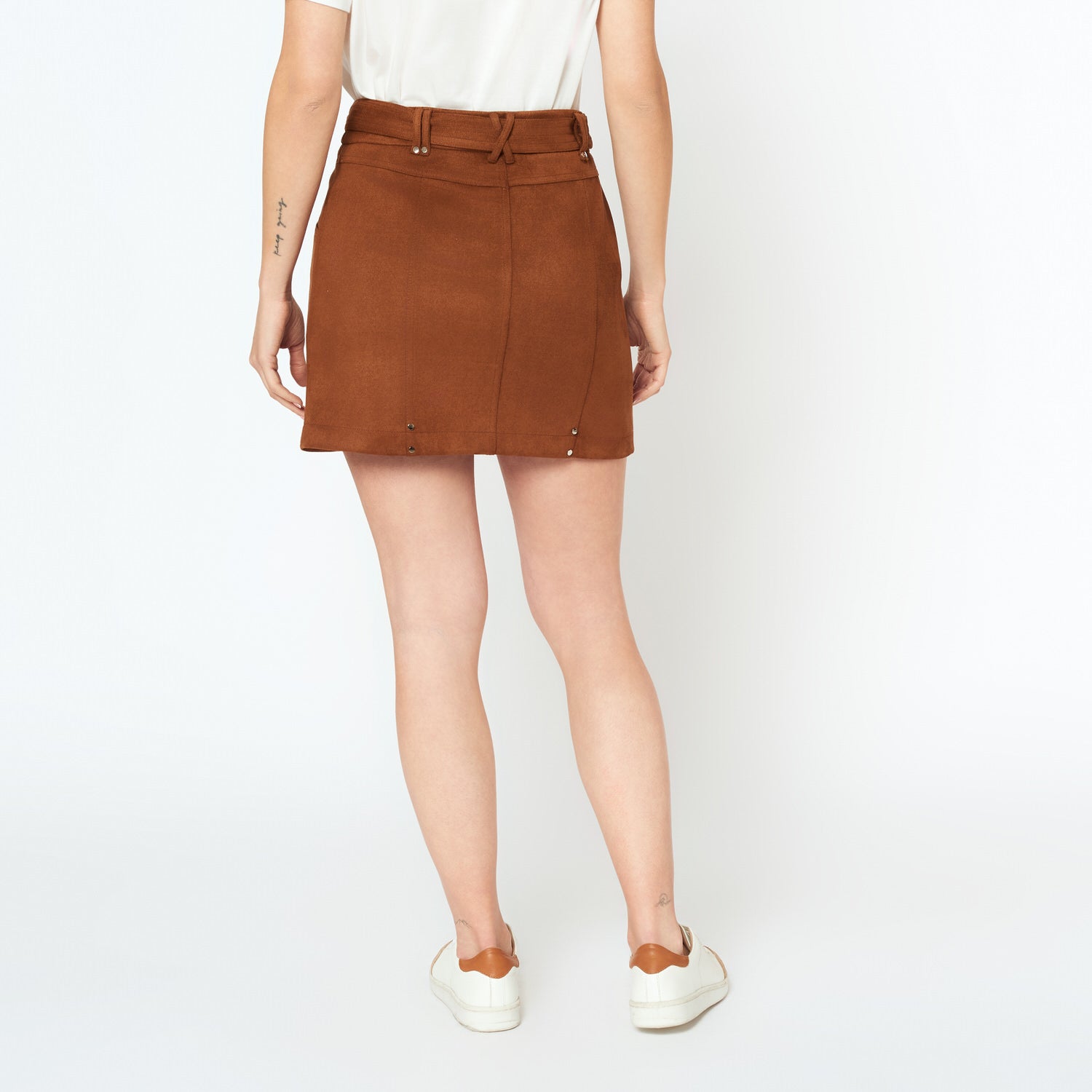 La falda Aracely en tono camel está hecha de gamuza, aportando textura y sofisticación. Perfecta para combinar con blusas ligeras o polos ajustados, creando un look otoñal con mucha personalidad.