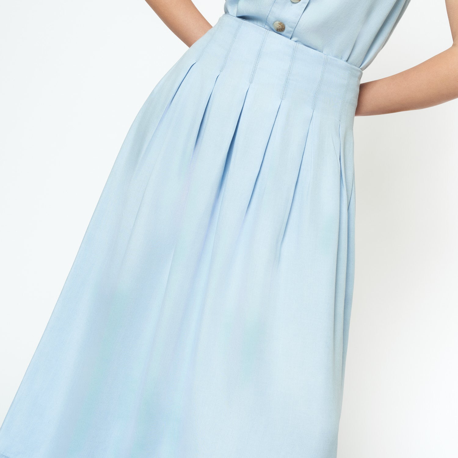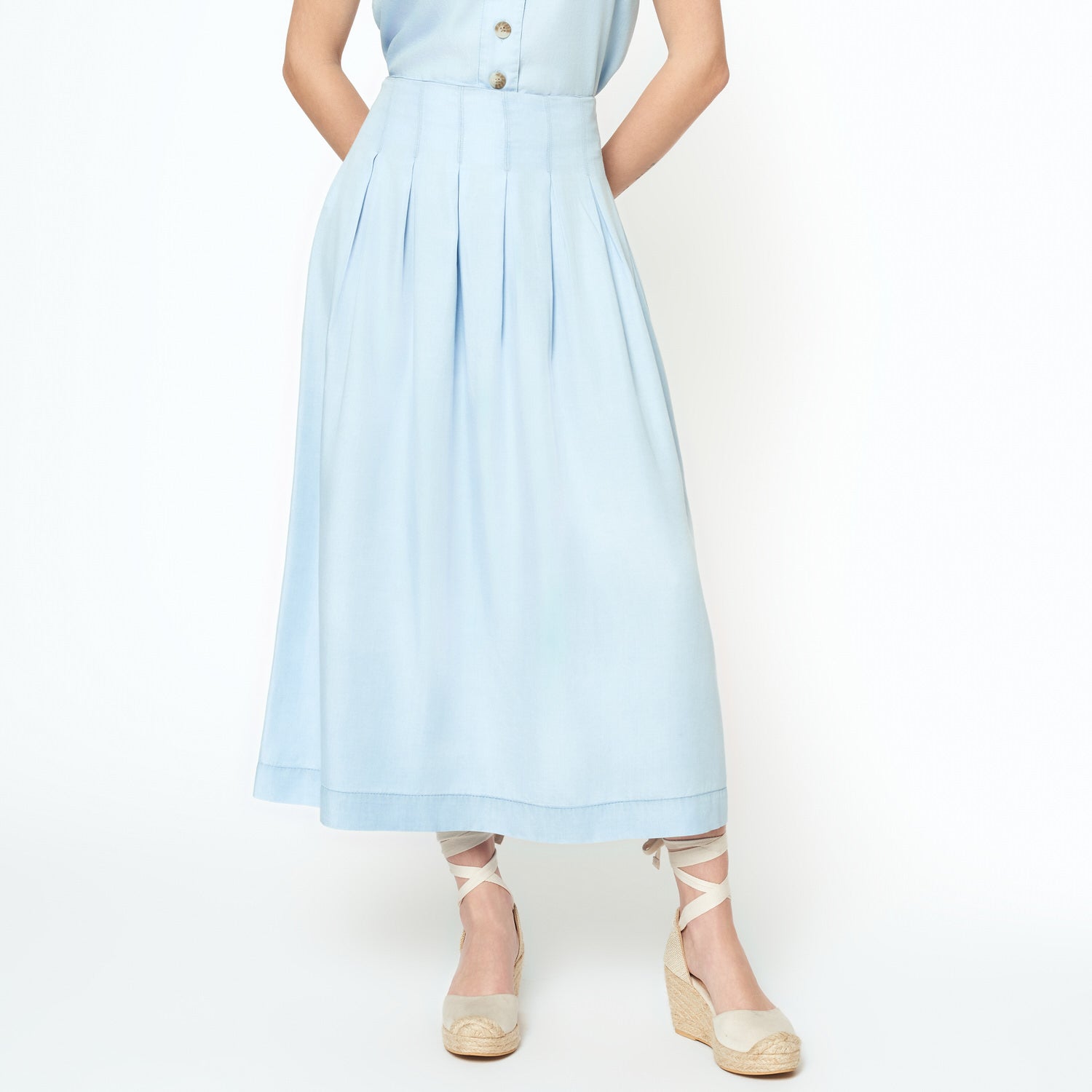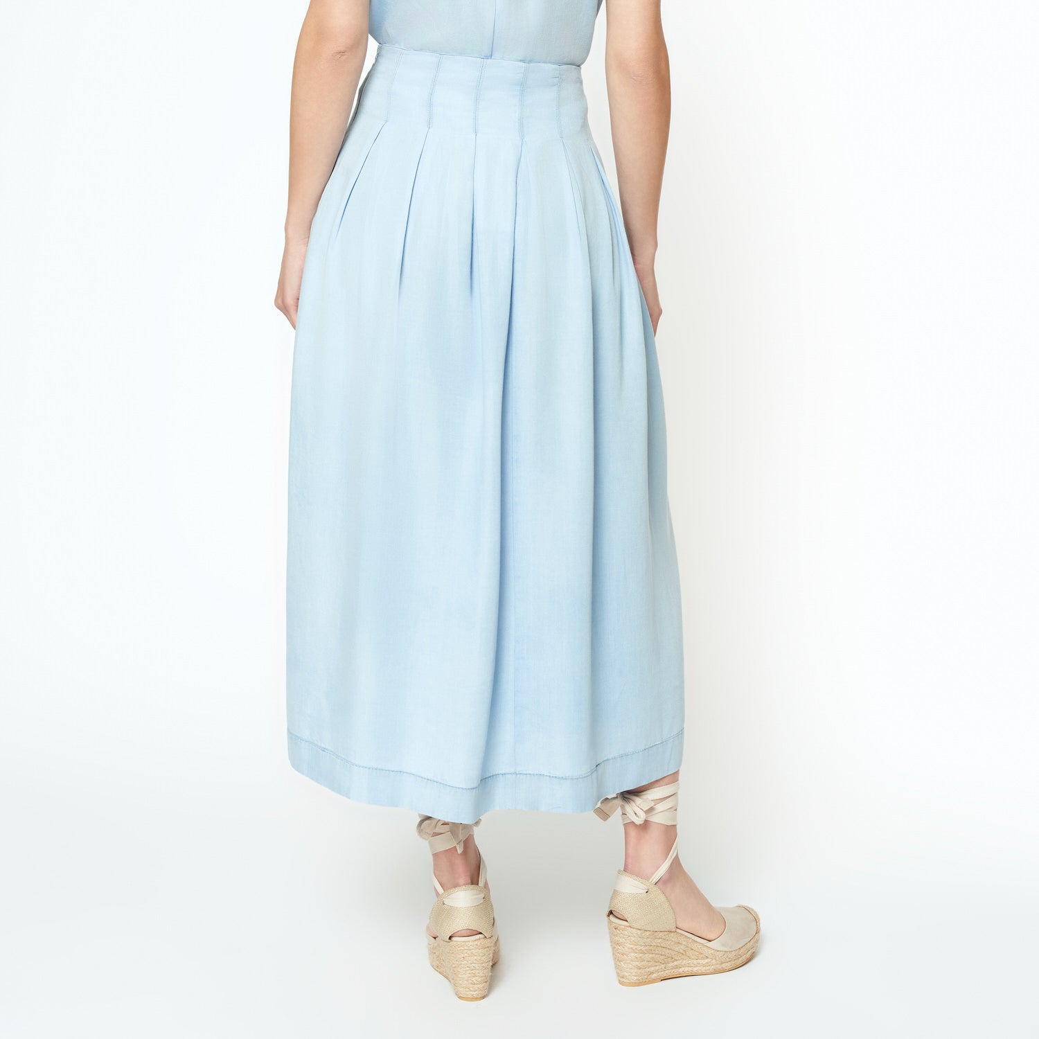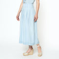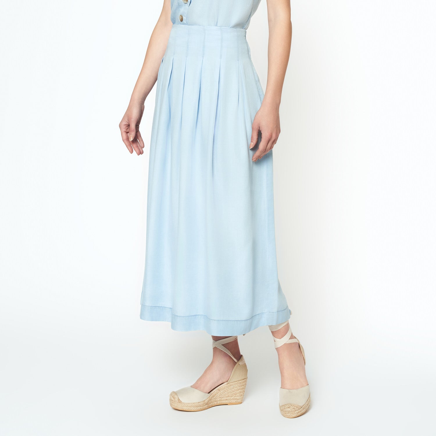 La Falda Melina en celeste es femenina y atemporal. Su tono claro la hace versátil y elegante, ideal para un outfit chic y pulido