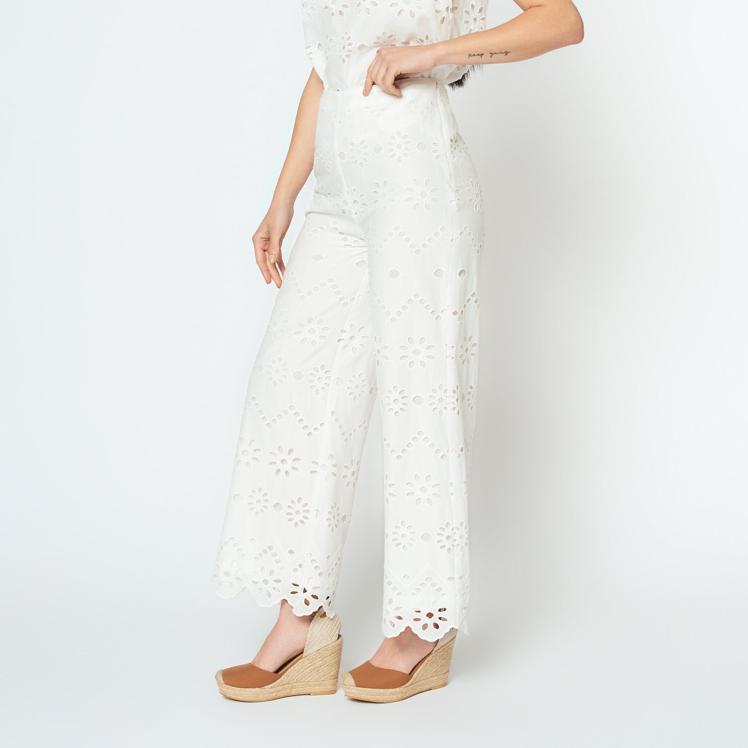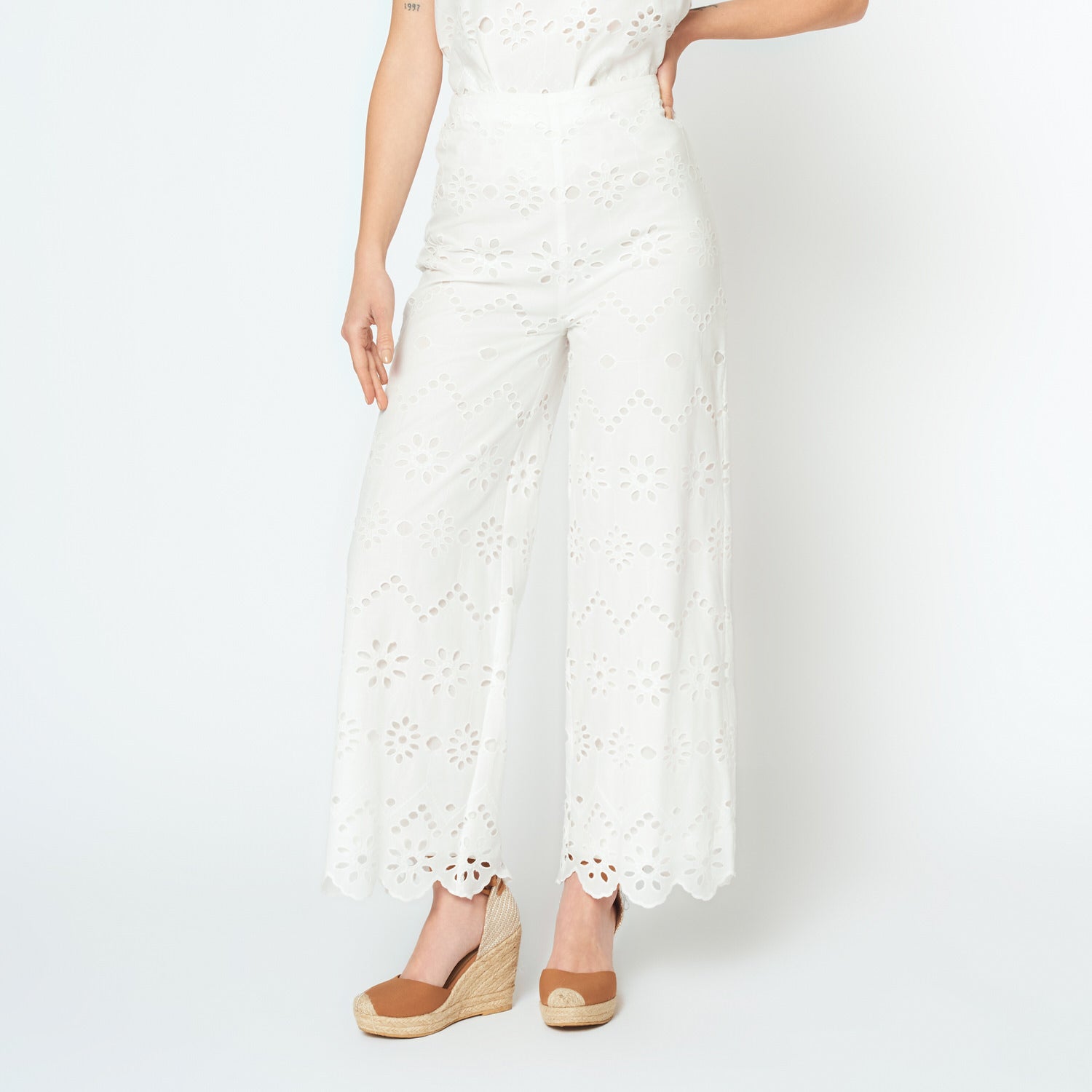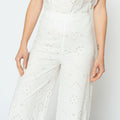 El Pantalón Petra en broderie hueso combina comodidad y delicadeza. Su diseño recto con textura ligera lo convierte en una prenda diferente y con mucho estilo, ideal para looks casuales chic.