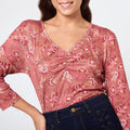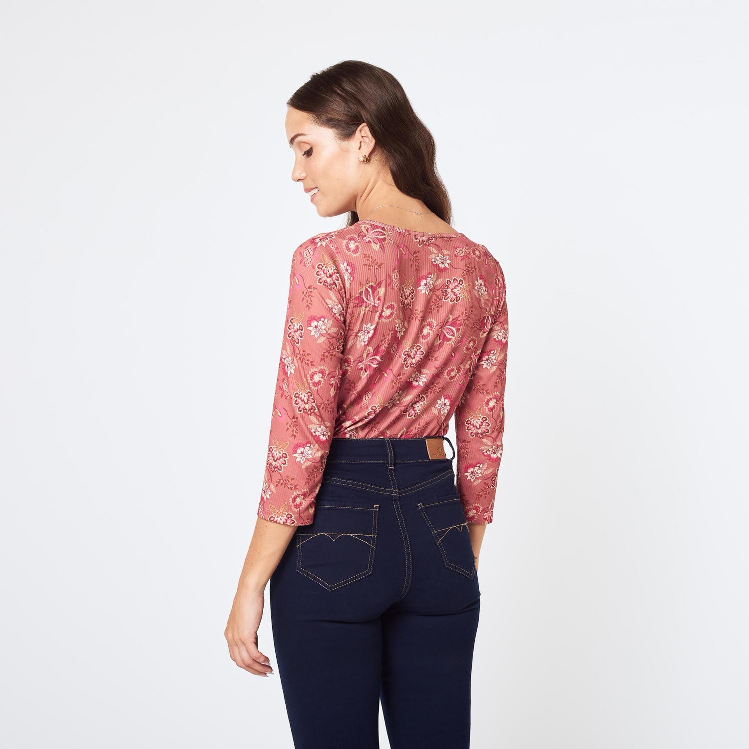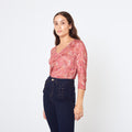 Luce un estilo bohemio con nuestro polo Danica de manga 3/4, con un encantador print de paisleys floreados en tela acanalada. Su cuello en V añade un toque de estilo adicional. ¡Este polo es la elección perfecta para quienes buscan destacar con un estilo único y moderno!