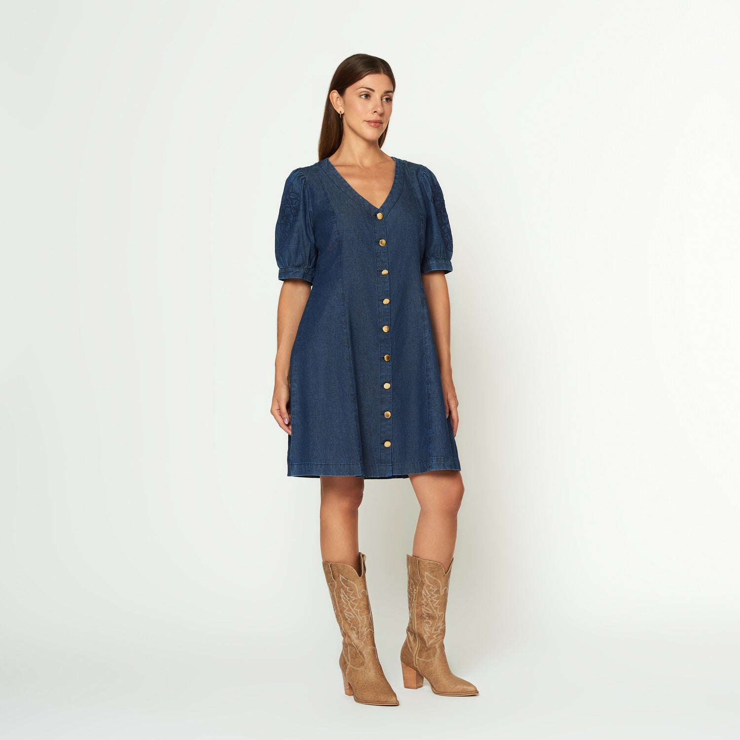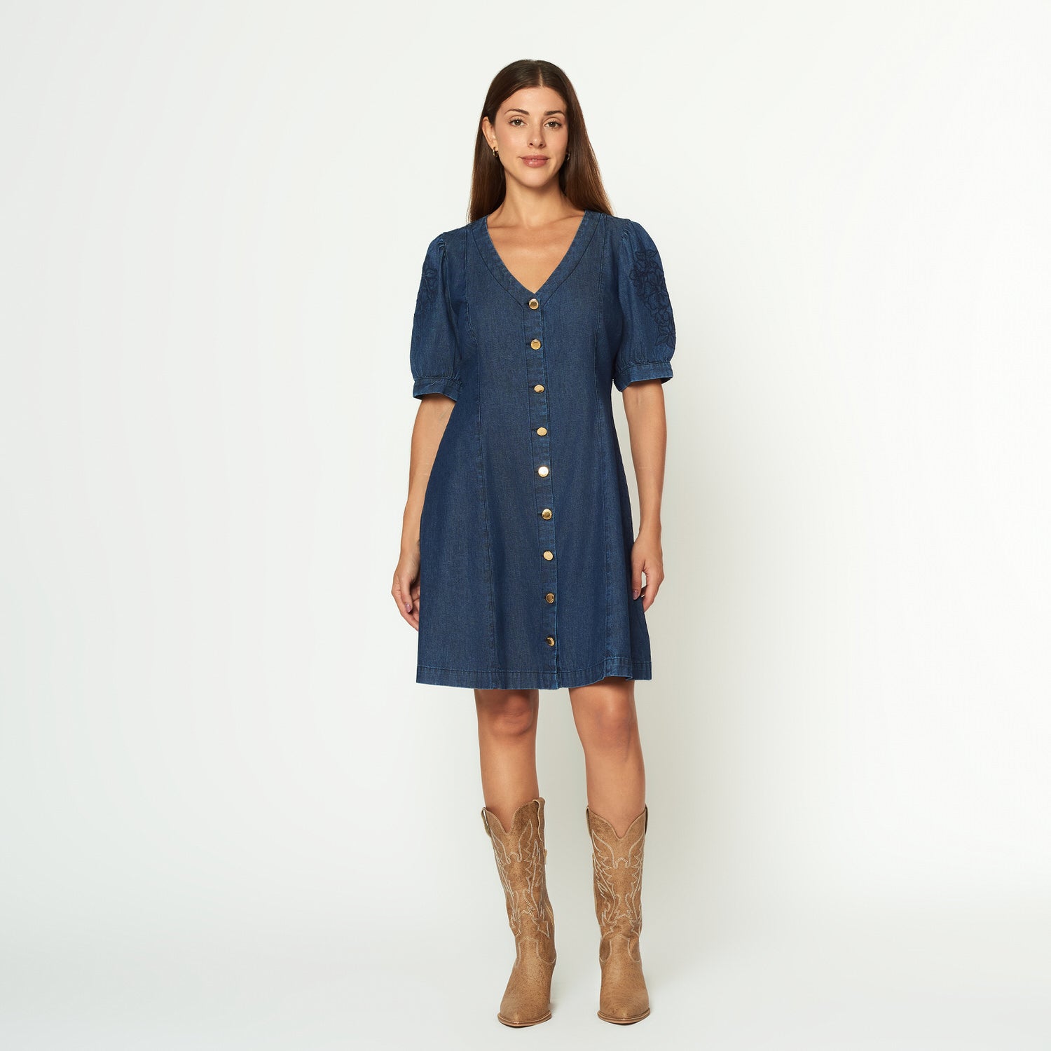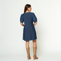 Vestido corto en denim con bordado en manga ligeramente abullonada.