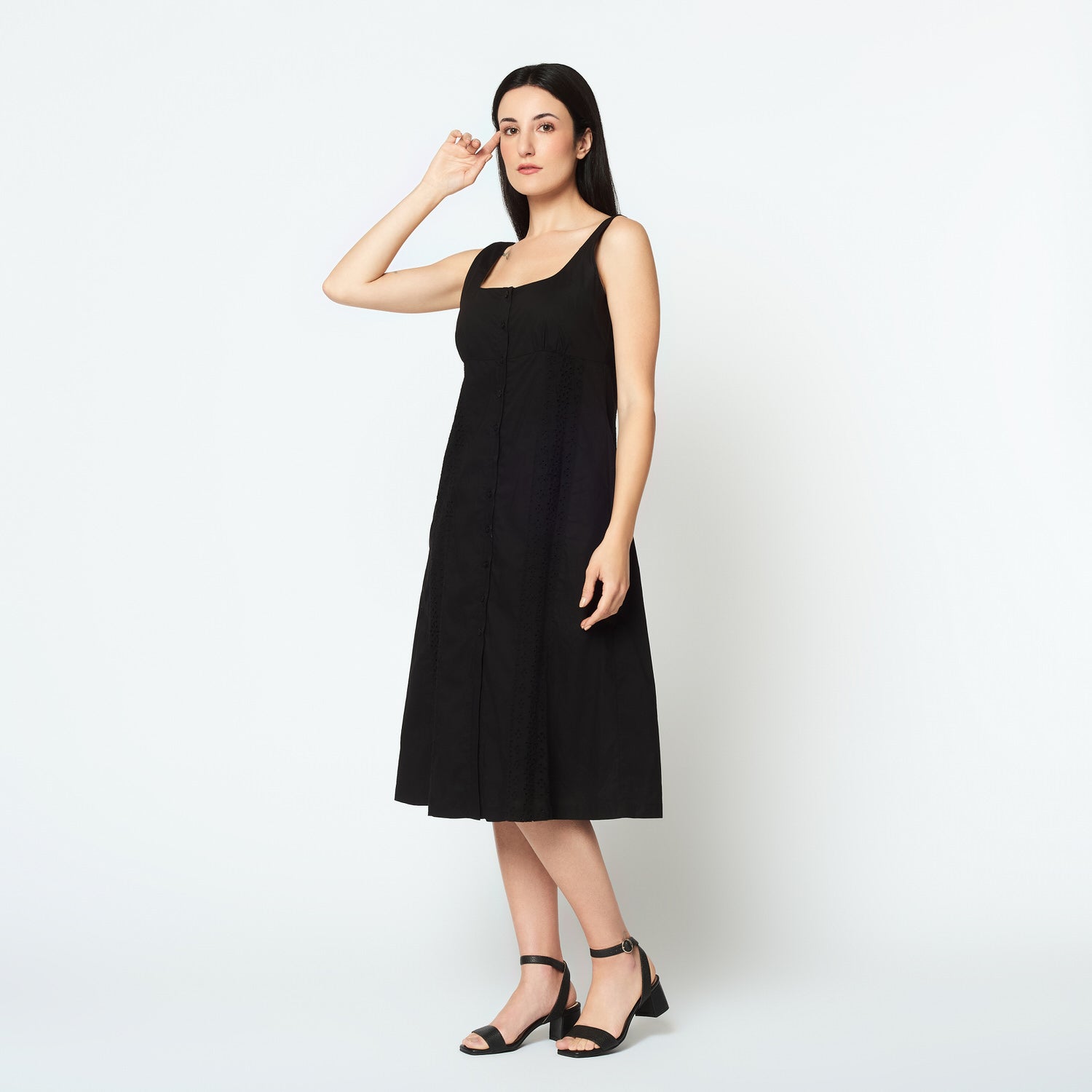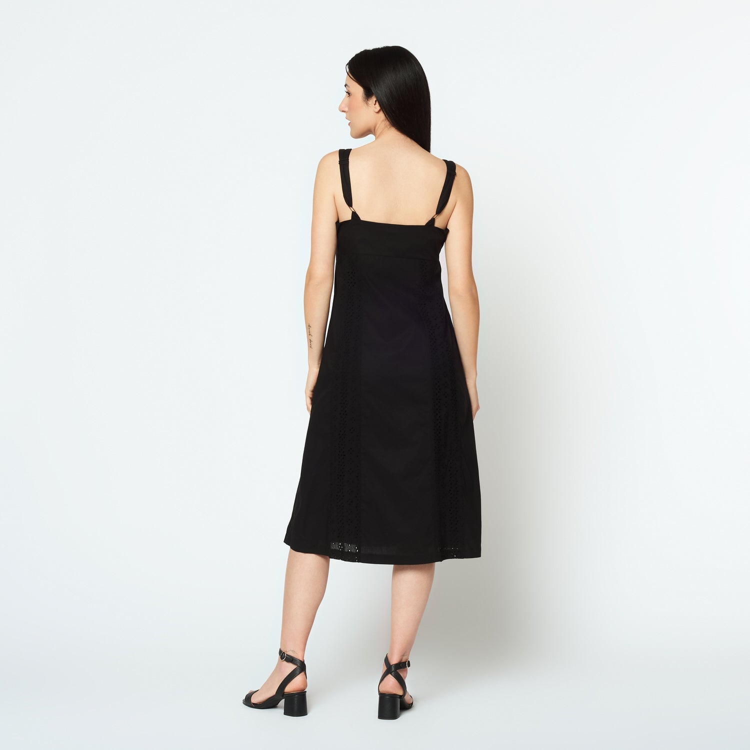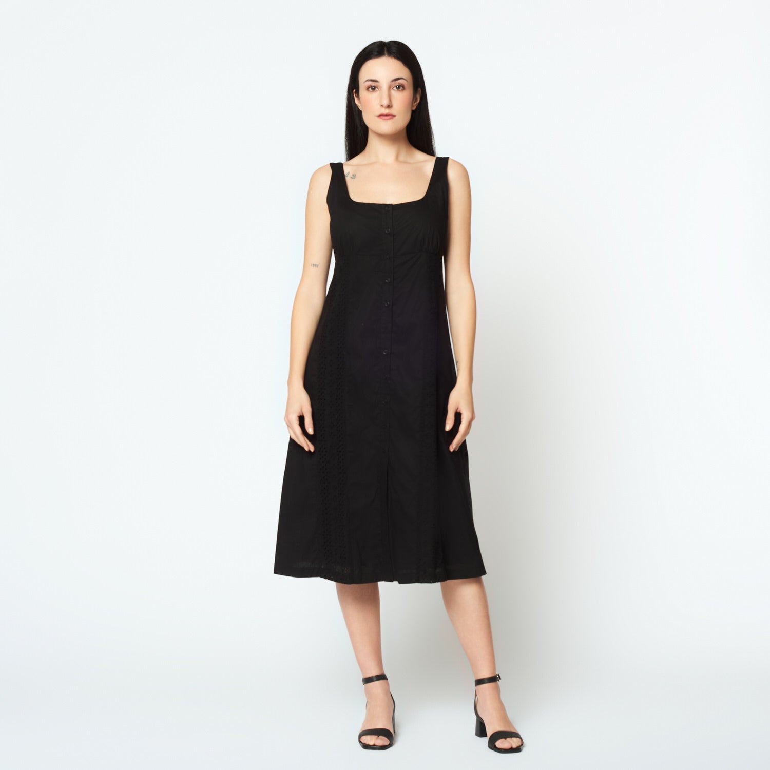Confeccionado en popelina negra, el vestido Pierina estiliza la silueta con un corte limpio y sofisticado. Su color sobrio lo hace ideal para ocasiones formales, pero también se adapta a un estilo urbano con accesorios modernos.